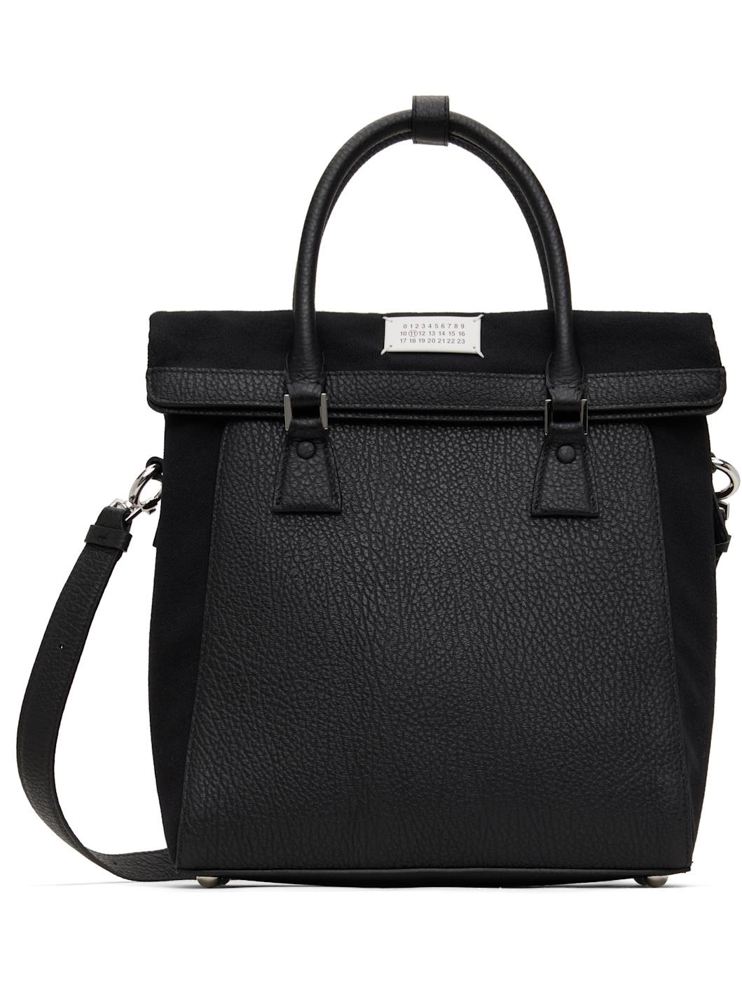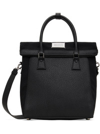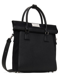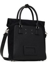Grained calfskin and canvas tote in black. Alternate styling as backpack. · Press-stud tab at rolled carry handles · Adjustable, detachable, and convertible shoulder strap · Bumper studs at base · White stitching and ID slot at back face · Logo patch at foldover closure · Patch pocket at interior · Twill lining · H15.15" x W12" x D4.5" Supplier color: Black