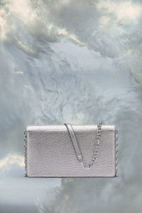 In metallic grainy leather with a chain, the medium wallet has a snap button closure and zipped inner section plus card slots. It features the numeric logo inside. Maison Margiela's signature, the Four stitches, appear on the flap; the opposite of a label. Product Details Item ID SA3UI0008P6749H3809 Body: 100% calf leather Lining: 100% viscose Metallized grainy leather wallet Removable chain and leather strap Four stitchesat the front Magnetic button closure Flat pocket at the back Logo stamp inside Zip pocket inside Internal flat pockets Made in Italy 19 cm x 4 cm x 11 cm/7,5 in x 1,5 in x 4,5 in (Length x Width x Height) Shoulder strap drop: 53 cm/20,8 in