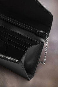 The medium wallet in shiny calf leather features a chain strap. Maison Margiela’s signature, the Four stitches, appear on the flap; the opposite of a label. Product Details Item ID SA1UI0037P5135T8013 Body: 100% calf leather Inside: 100% ovine leather Lining: 100% viscose-rayon Shiny leather wallet on chain Removable and adjustable chain and leather strap Four stitches at the front Snap closure Flat pocket at the back Inside logo stamping Inside zip pocket Inside flat pockets Keep in a dry place, if it gets wet dry immediately with a dry cloth and if there are streaks, clean with a cotton cloth Made in Italy 19,5 cm x 11,5 cm/7,6 in x 4,5 in (Length x Height) Max. shoulder strap drop: 54 cm/21,2 in Min. shoulder strap drop: 46,5 cm/18,3 in