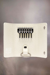 Crafted from embossed grainy leather, the key holder features a keyring and six hooks, with two snap button closures and inner numeric logo. Maison Margiela's signature, the four stitches, appear at the back; the opposite of a label. Product Details Item ID SA3UA0001P4455H9677 Outer: Chrome-tanned calf grainy leather with soft touch Lining: Viscose Four stitches at the front Snap buttons closure Inside logo stamping Inside hooks Inside key chain Inside card slot Clean with a specific leather cleaner product and a humid microfiber cloth Made in Italy 10,5 cm x 7 cm/4 in x 2,5 in (Length x Height)