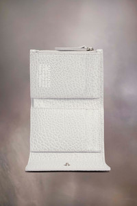 In embossed grainy leather, the wallet features the numeric logo inside with four card holders and a zipped section. Maison Margiela's signature, the four stitches, appear on the back; the opposite of a label. Product Details Item ID SA3UI0010P4455T1003 Outer: Grainy calf leather with soft touch Lining: Viscose Four stitchesat the front Snap button closure Inside logo stamping Inside zip pocket Inside flat pocket Six inside card slots Clean with a specific leather cleaner product and a humid microfiber cloth Made in Italy 10,5 cm x 8 cm/4 in x 3 in (Length x Height)