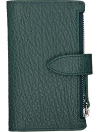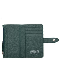 Grained calfskin card holder. · Signature white stitches at back face · Press-stud closure · Four card slots · Two patch pockets · Zip coin compartment · Grained calfskin interior · Moire lining · H5" x W3" x D0.5" Supplier color: Green Body: 100% calfskin. Lining: 100% viscose. Made in Italy 261168M163007