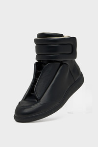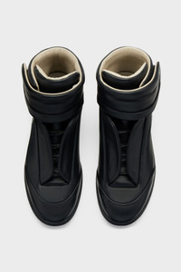 Originally launched in the SS11 collection, the Future sneaker is reintroduced this season. Defined by its seamless construction and concealed fastening. Built without visible laces, a hidden strap folds across the tongue to create a uniform surface, evoking anonymity and restraint. Crafted in soft calfskin, the mid-top silhouette is finished with a tonal sole. Maison Margiela's signature single white stitch appears at the back. Product Details Item ID S57WS0538P7573T8013 Upper: 100% calf leather Lining: 100% calf leather Inside: 100% calf leather Sole: 100% rubber Padded ankle strap sneaker Velcro closure at ankle Four stitches at the back Made in Italy