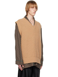 Knit stretch wool- and cashmere-blend vest. · Rib knit V-neck, hem, and armscyes · White stitching at back Supplier color: Camel