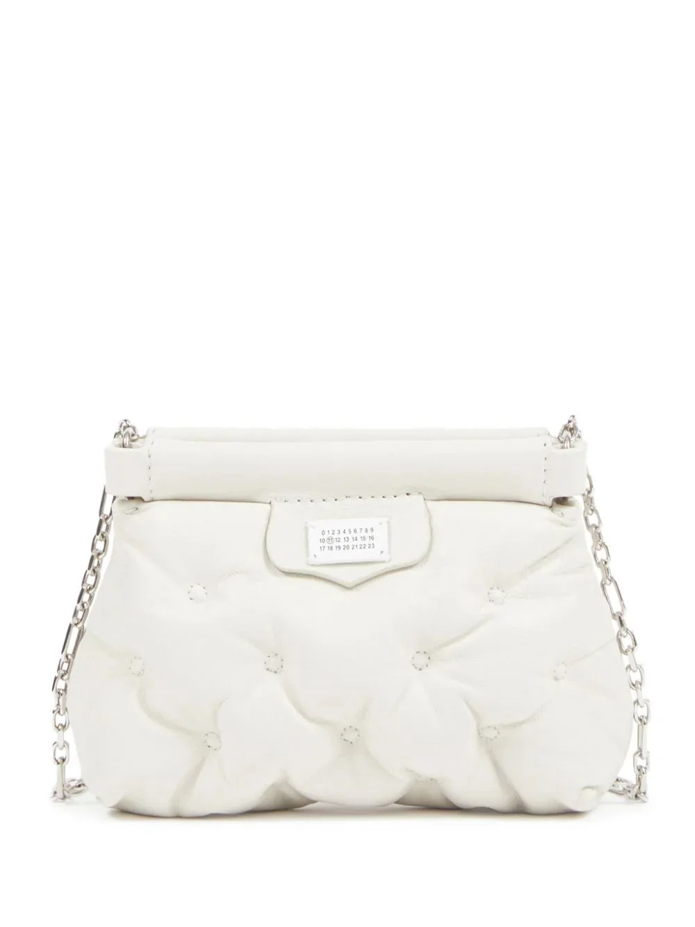 Glam Slam Classique Baby in Greige from Maison Margiela Highlights - greige - lambskin - grained texture - quilted - logo patch to the front - signature numbers motif - detachable chain-link shoulder strap - magnetic fastening - main compartment - debossed internal logo - full lining Made in Italy Composition: Lining: Polyester 100%, Outer: Lamb Skin 100% Designer ID: SA1VL0035P6434 Color ID: H9677