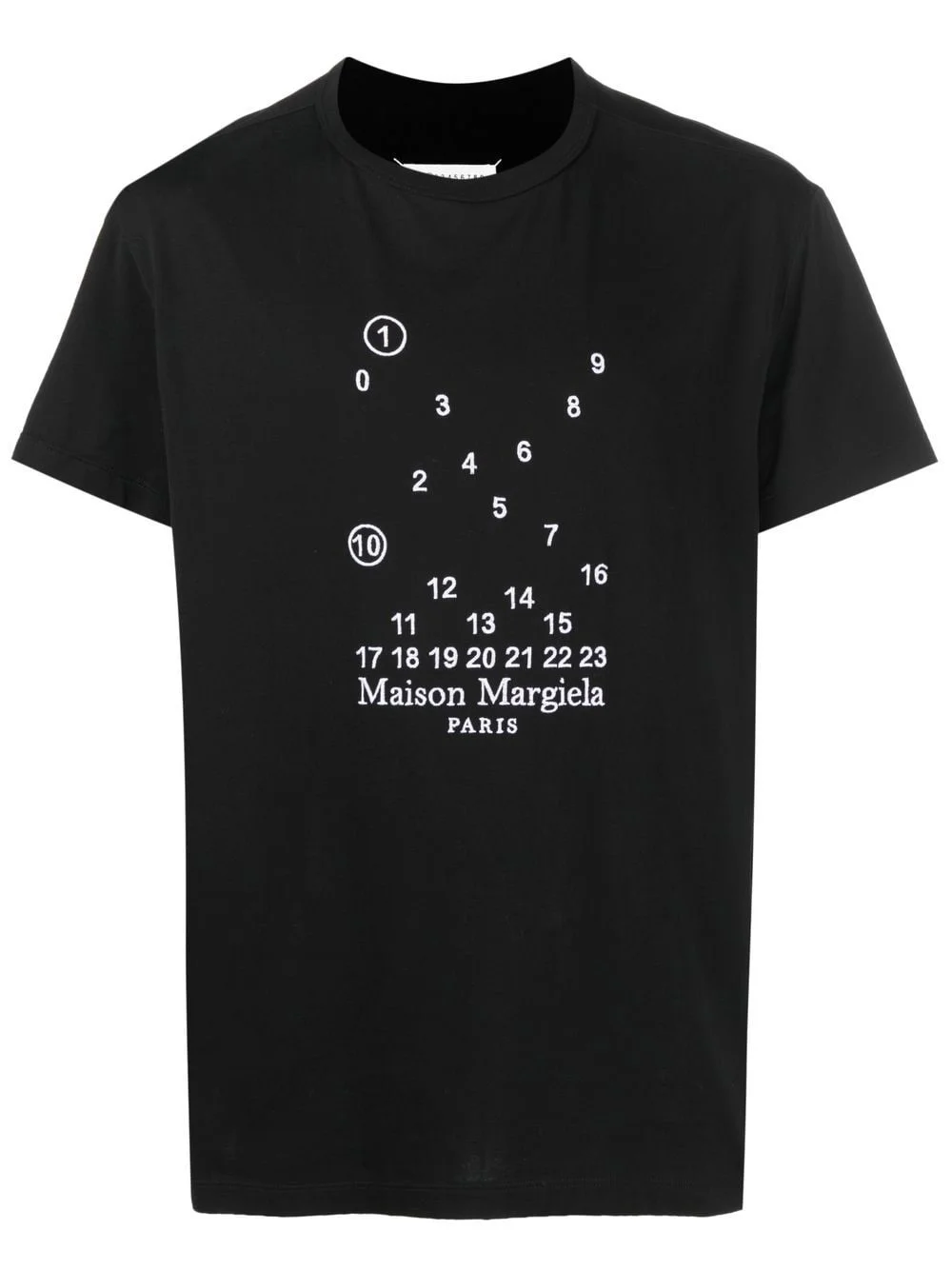 Numeric logo-embroidered T-shirt Tying in with contemporary branding trends, this short-sleeve T-shirt form Maison Margiela features the signature numbers logo across the front. In a contrasting colourway, this element stands out even more. Highlights - Black - Cotton - Graphic print to the front - Round neck - Short sleeves - When buying this unisex item, keep in mind that it is graded in standard men's sizing. Made in Italy Composition Cotton 100% SIZE & FIT Model measurements Height 5 ft 11 in(1.8 m) Bust/Chest 31.88 in(81 cm) Hips 35.03 in(89 cm) Waist 24.01 in(61 cm) Measurement CHEST 41.73 in(106 cm) FittingInformation This piece fits true to size. We recommend you get your regular size Cut for a relaxed fit Made with a mid-weight fabric Washing instructions Machine Wash