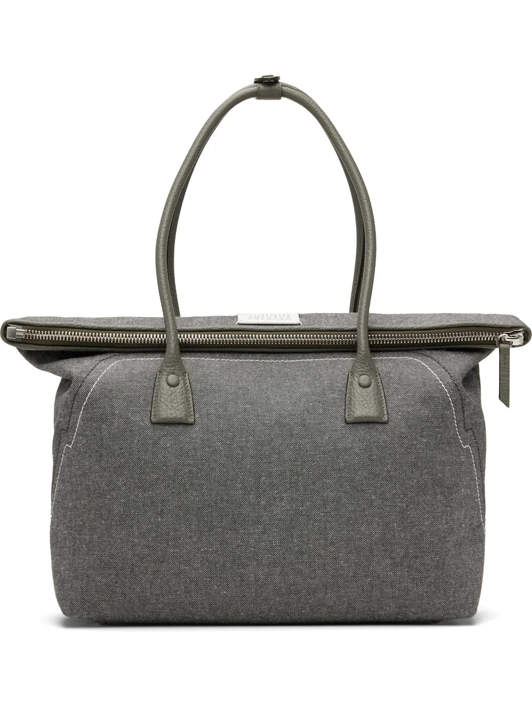 Grained calfskin and canvas tote. · Rolled leather carry handles · Logo patch at top · Stitching at back face · Bumper studs at base · Zip closure · Zip pocket at interior · Twill lining · H13" x W14" x D5.5" Supplier color: Caillou Textile, calfskin. Made in Italy 252168M172010
