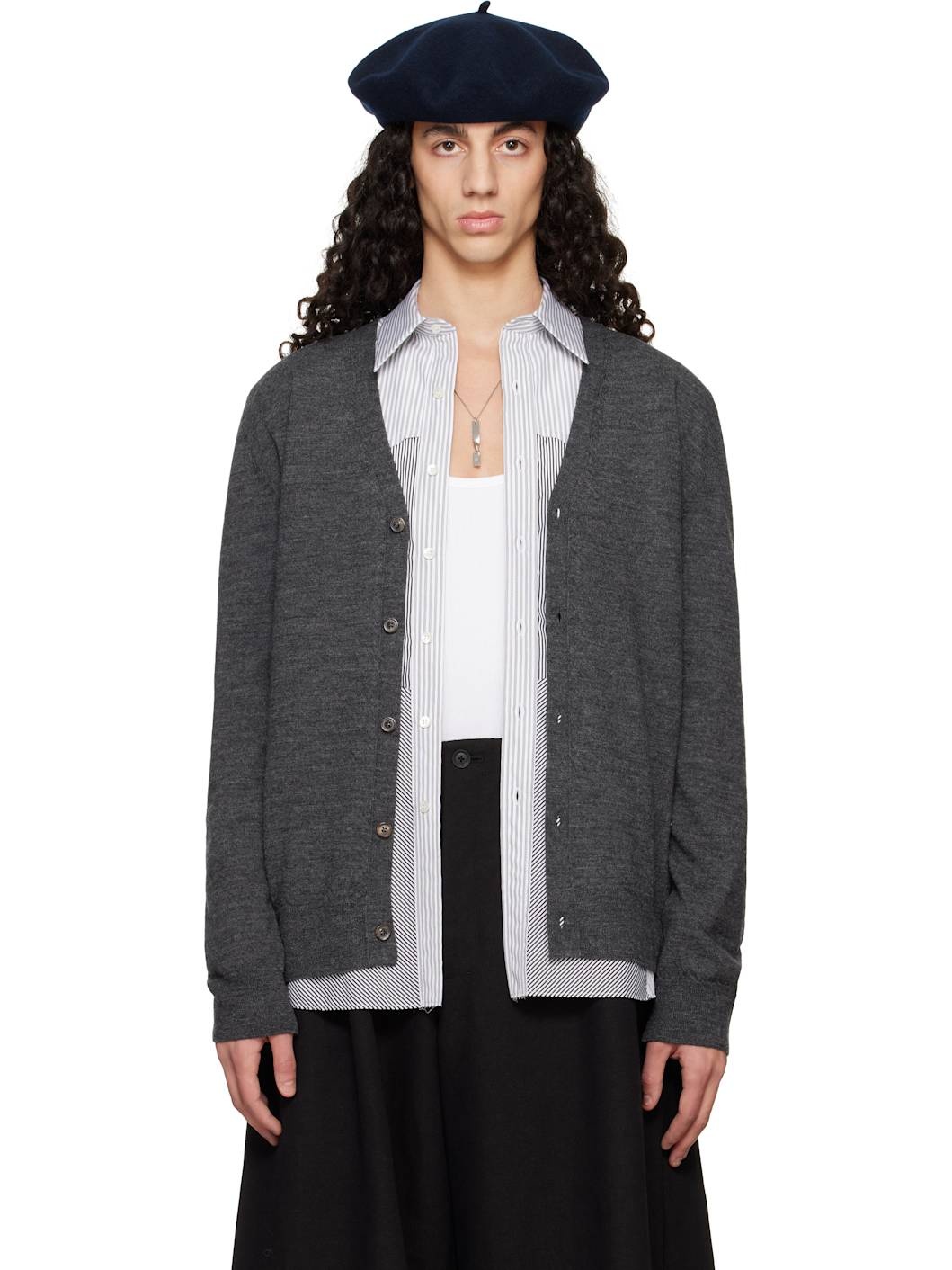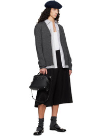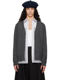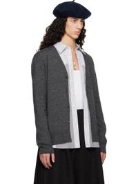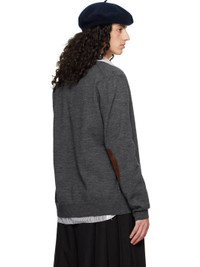 Knit wool cardigan. · Rib-knit Y-neck, hem, and cuffs · Button closure · Calfskin suede elbow patches · White stitching at back collar Supplier color: Charcoal