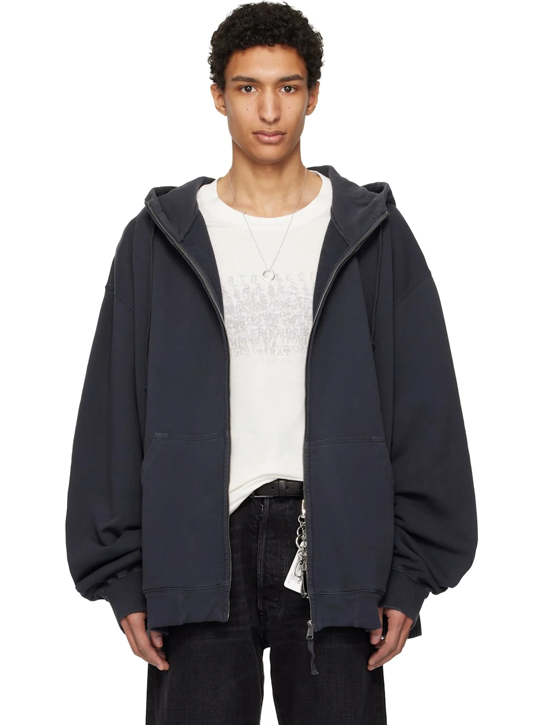 French terry hoodie. · Drawstring at hood · Zip closure · Patch pockets at front · Rib-knit hem and cuffs · Dropped shoulders · White stitching at back collar · Embroidered logo with loose threads at back Supplier color: Washed black 100% cotton. Made in Italy 261168M202001