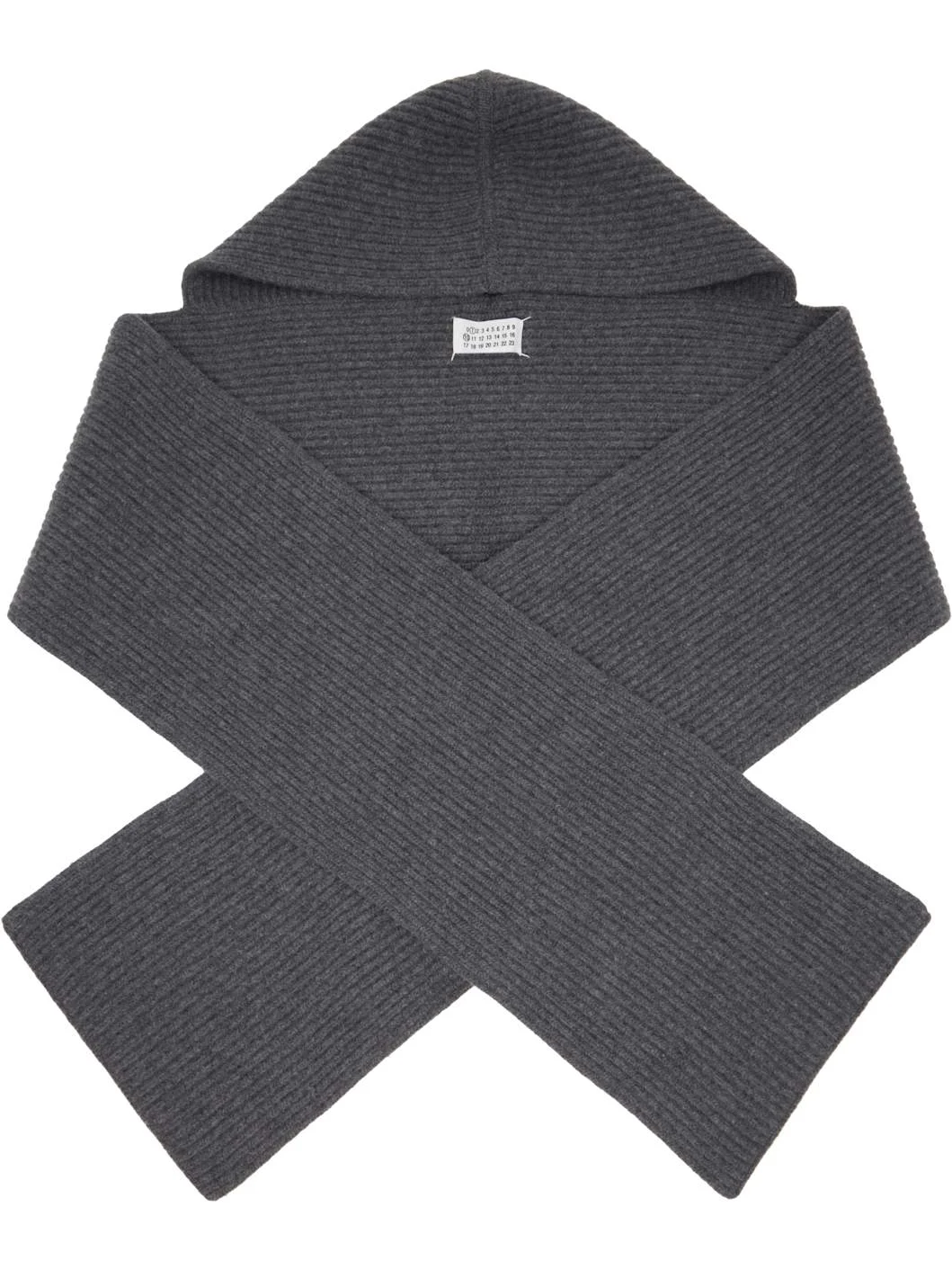 Rectangular rib-knit virgin wool scarf. · White stitching at face · Central hood · L91" x W10.5" Supplier color: Dark grey 100% virgin wool. Made in Italy 261168M150003