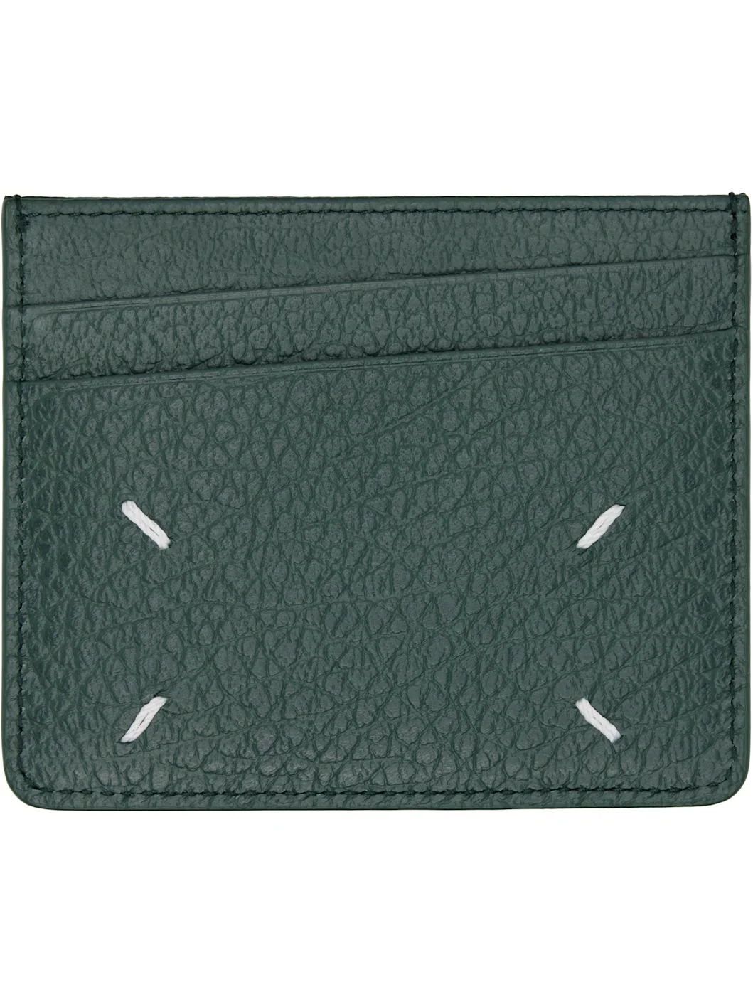 Grained calfskin card holder. · Stitching at face · Five card slots · Central note slot · Canvas lining · H3.25" x W3.75" Supplier color: Bottle Green Calfskin. Made in Italy 261168M163017