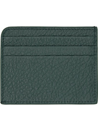 Grained calfskin card holder. · Stitching at face · Six card slots · Central note slot · Canvas lining · H3” x W3.75” Supplier color: Bottle Green Calfskin. Made in Italy 261168M163004