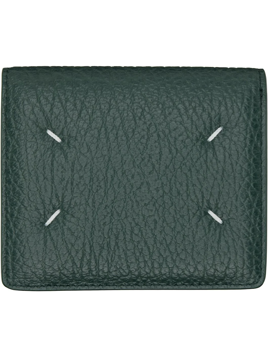 Grained calfskin bifold wallet. · White stitching at face · Press-stud closure · Four card slots and one patch pocket at interior · One note slot · Press-stud coin compartment · H4.25" x W3.5" x D1" Supplier color: Bottle green Calfskin. Made in Italy 261168M164015