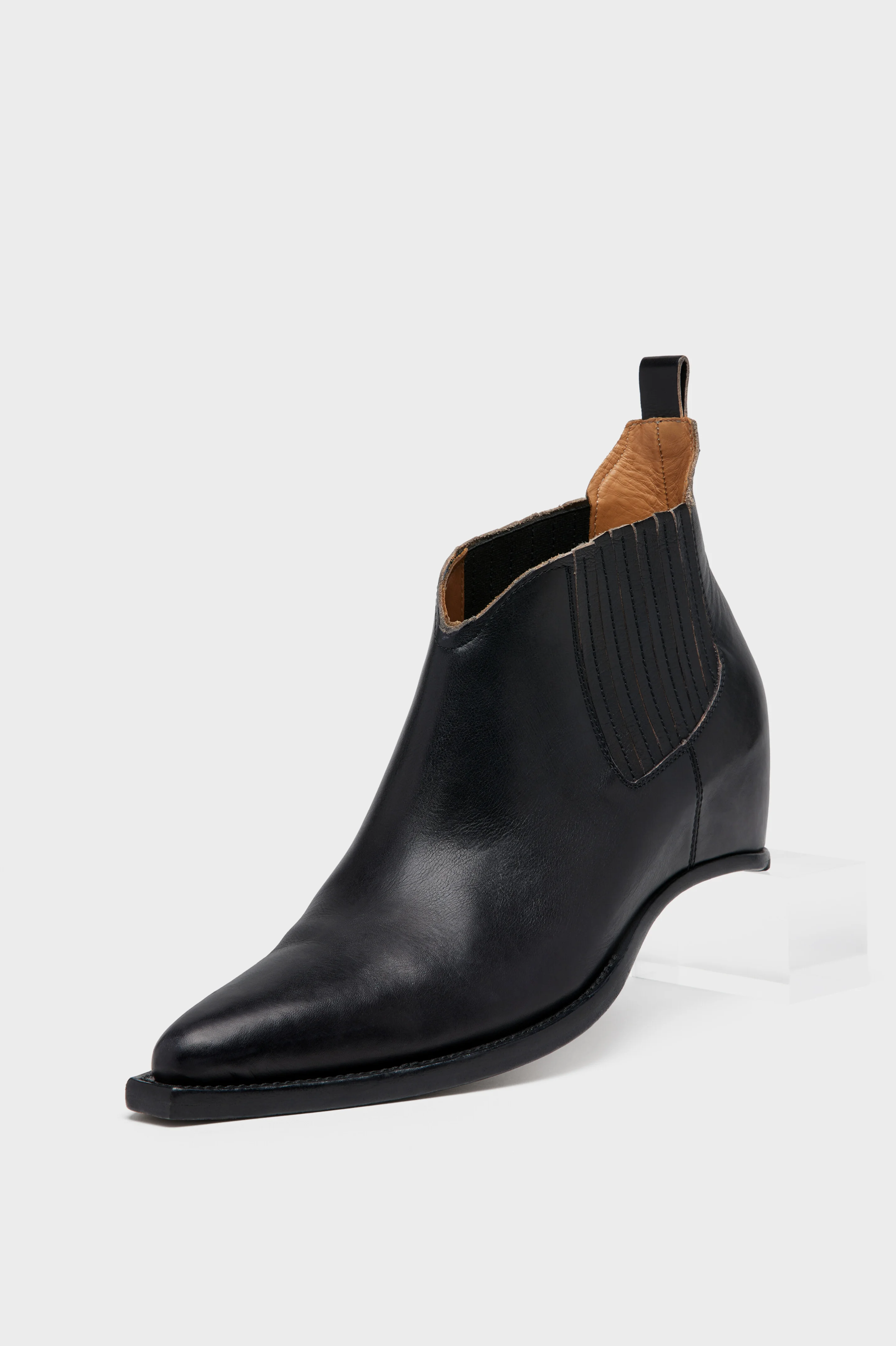 An archival reference, the heel-less western chelsea boot is defined by a continuous curved sole that encases a hidden heel. Hand-crafted in vintage-treated leather, the upper is clean and minimal, shaped with elasticated side panels and a pointed toe. The integrated construction creates a stable silhouette with a subtly elongated profile. At the back, the Maison’s single white stitch marks its signature. Product Details Item ID S97WU0080P7677T8013 Upper: 100% calf leather Lining: 100% calf leather Inside: 100% calf leather Sole: 100% calf leather Contrast: 100% rubber Pointed toe ankle boots in vegetable leather Vintage treatment Curved wedge heel Elastic side inserts Made in Italy