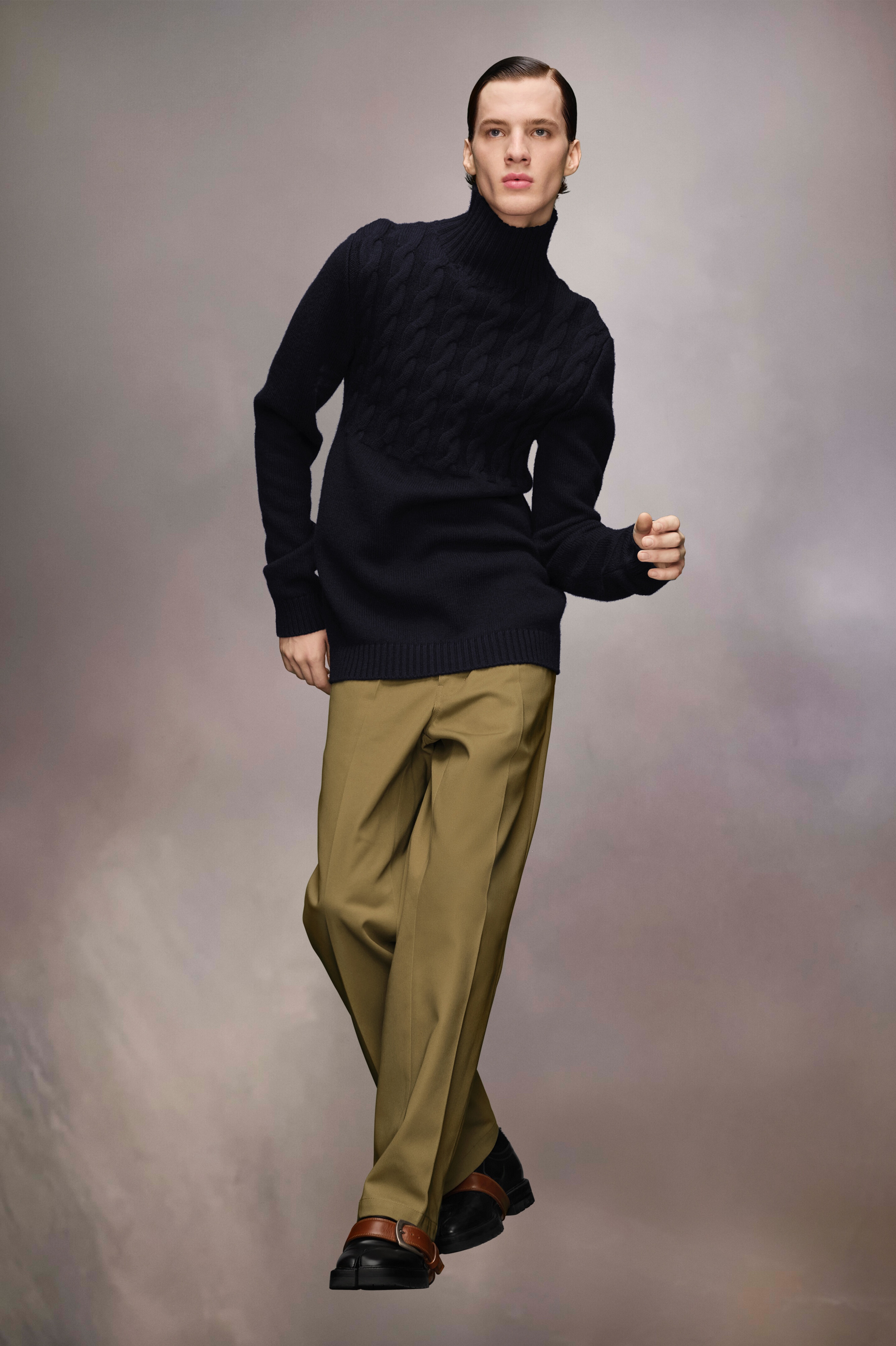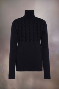Crafted from pure virgin wool, the sweater features a high-neck and cable knit top half. Maison Margiela's signature, the Four stitches, appear at the back; the opposite of a label. Gauge 7. Product Details Item ID S50HL0026M13061511 Composition: 100% virgin wool Gauge 7 Cable knit virgin wool jumper Turtleneck Ribbed trims Four stitches at the back Model is 6'2" tall and wears a size S.