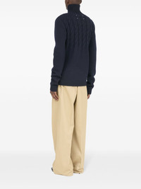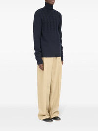 ELEVATE YOUR WINTER WARDROBE WITH OUR HIGH-NECK VIRGIN-WOOL SWEATER. MADE WITH NAVY BLUE VIRGIN WOOL, THIS CABLE KNIT SWEATER FEATURES A RIBBED EDGE AND HIGH NECK FOR ADDED WARMTH. WITH LONG SLEEVES AND A STRAIGHT HEM, IT'S BOTH STYLISH AND FUNCTIONAL. STAY COZY AND FASHIONABLE THIS SEASON.