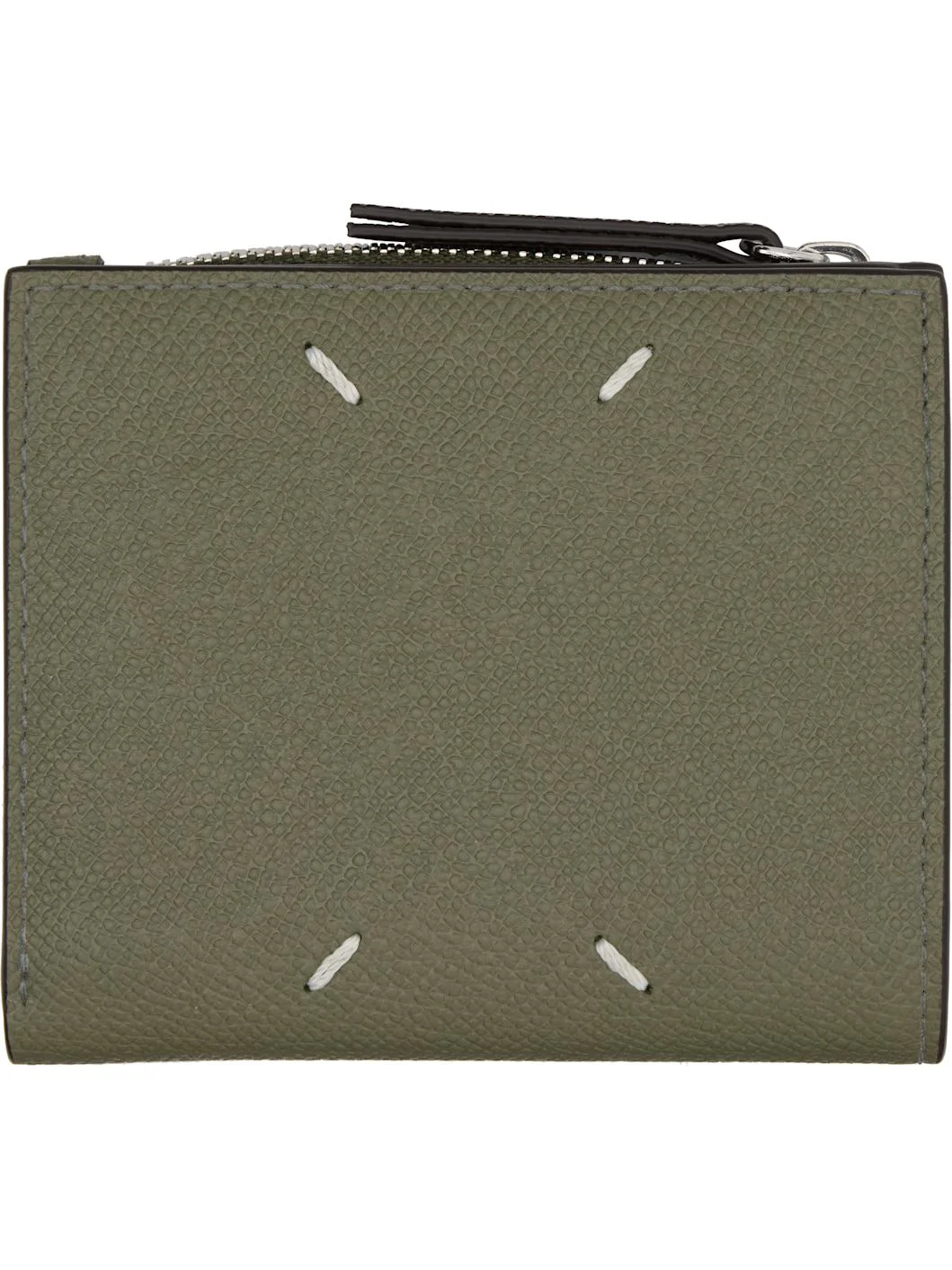 Grained calfskin bifold wallet. · White stitching at face · Six card slots and two patch pockets at interior · One note slot · Zip coin compartment · H3.5" x W4.25" x D1" Supplier color: Khaki Calfskin. Made in Italy 252168M164006