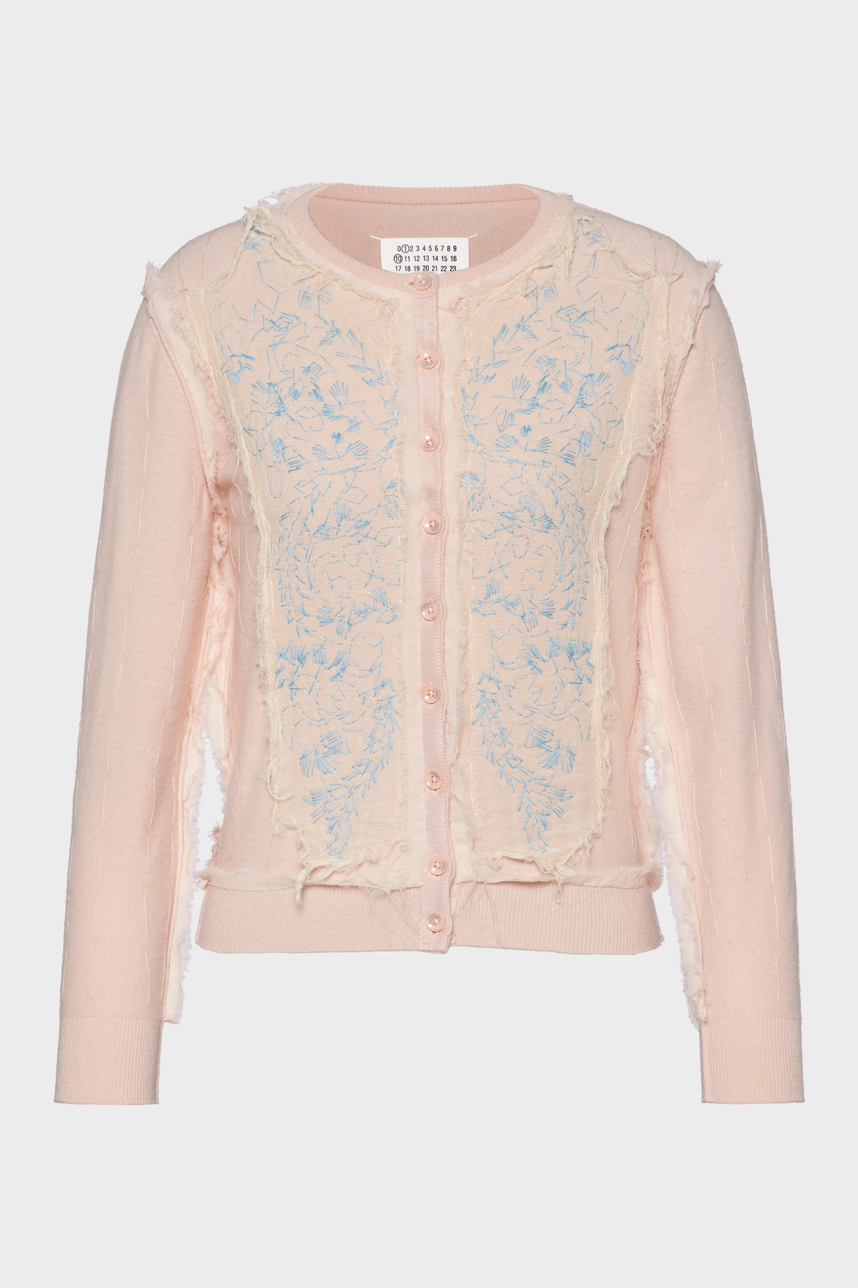This cardigan is framed by contrast, with applique patches that resemble the reverse side of delicately embroidered fabric. Vertical stitch lines mirror the inside of a garment, aligning with the Maison’s decortique approach. Maison Margiela’s signature, the four stitches, appear at the back; the opposite of a label. Product Details Item ID S51HP0022M13153216 Primary Fabric: 100% Virgin Wool Secondary Fabric: 54% Acetate 26% Polyamide-Nylon 20% Silk Secondary Fabric: 100% Cotton Fitted wool cardigan Overlay with raw-edged embroidered panels Button-through front Ribbed cuffs and hem Four stitches at the back Made in Italy