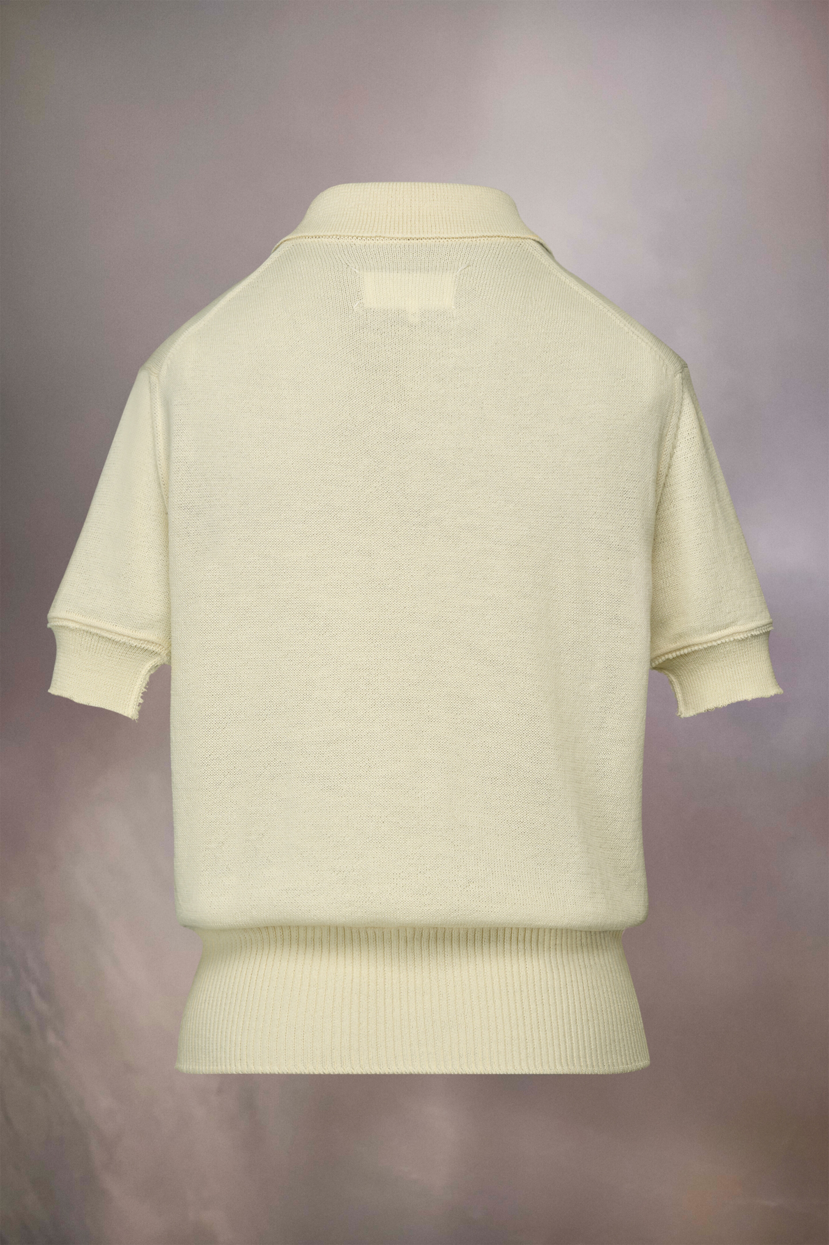 The potato sack knit polo shirt features a classic collar and three buttons with ribbed trims to finish. Maison Margiela's signature, the four stitches, appear at the back; the opposite of a label.