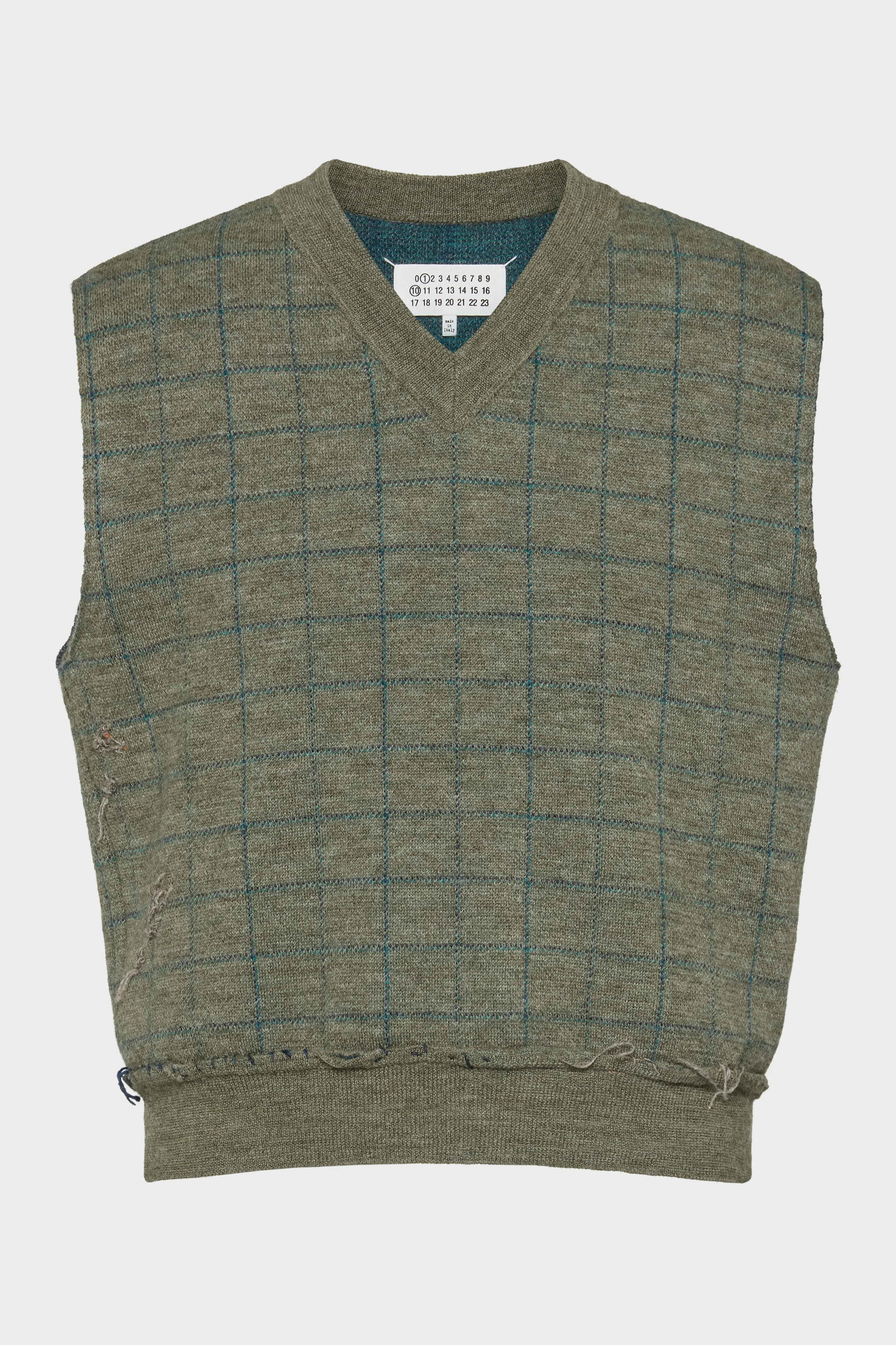 In a classic checked design, this sleeveless V-neck vest reflects the collection’s textured interpretation of countryside classics. It is crafted in a Charles patching knit – a technique inspired by the tradition of King Charles mending his garments – while a raw edge finish evokes the tactility of heritage knitwear. Maison Margiela’s signature, the four stitches, appear at the back; the opposite of a label. Product Details Item ID S50FB0116M13146613J Primary fabric: 100% virgin wool Sleeveless knit vest in checked virgin wool V-neckline and ribbed hem with distressed detailing Four stitches at the back Made in Italy