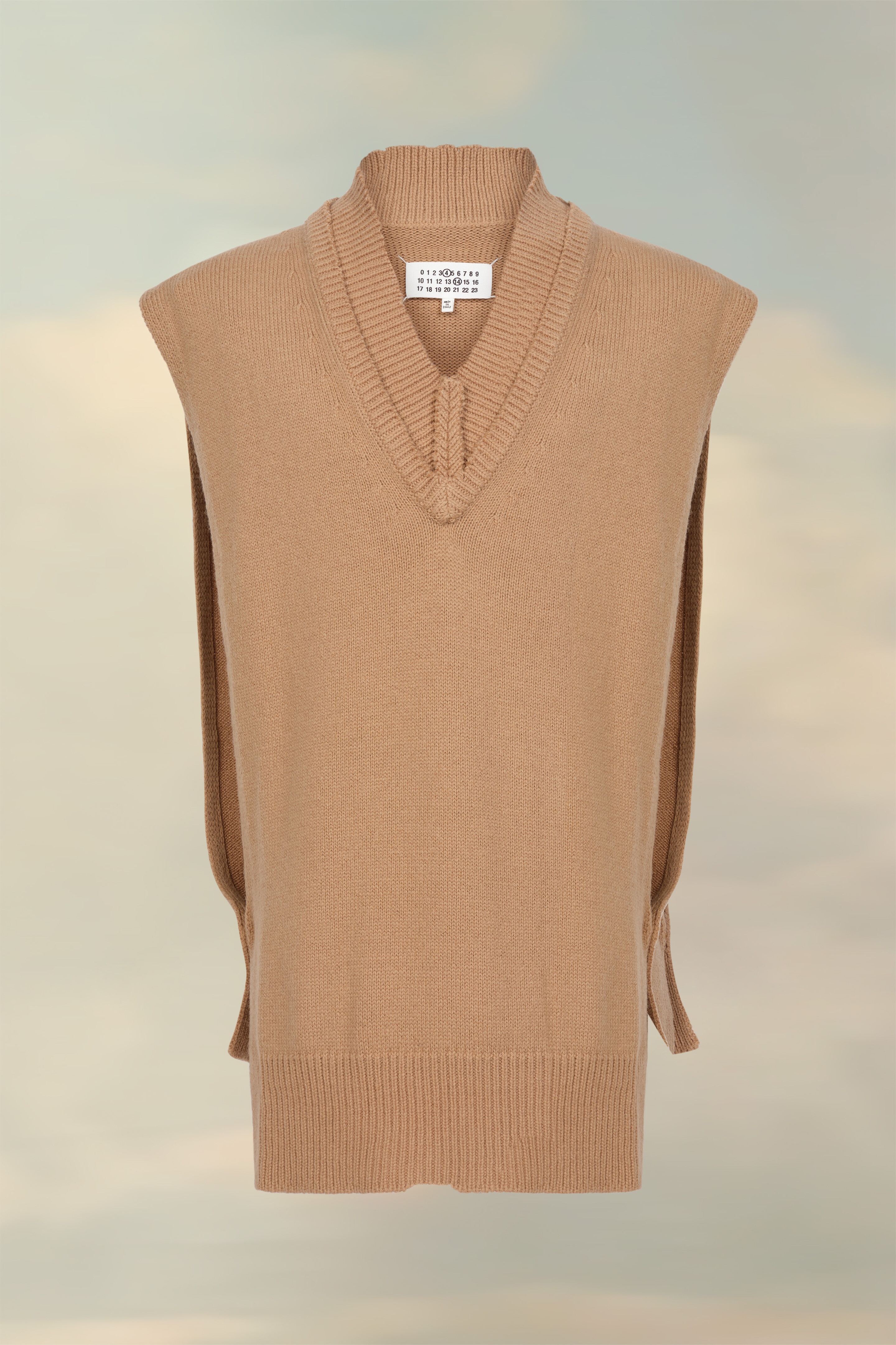 This oversized knit vest in jersey has a layered V-neck and ribbed trims for added texture. At the back, four white stitches show the hand of the Maison: the opposite of a label. Gauge 5. Product Details Item ID SI1TH0001S18064106F Composition: 46% Wool, 31% Linen, 23% Cotton V-neck vest Ribbed trims Décortiqué details Four stitches at the back Gauge 5 Made in Italy