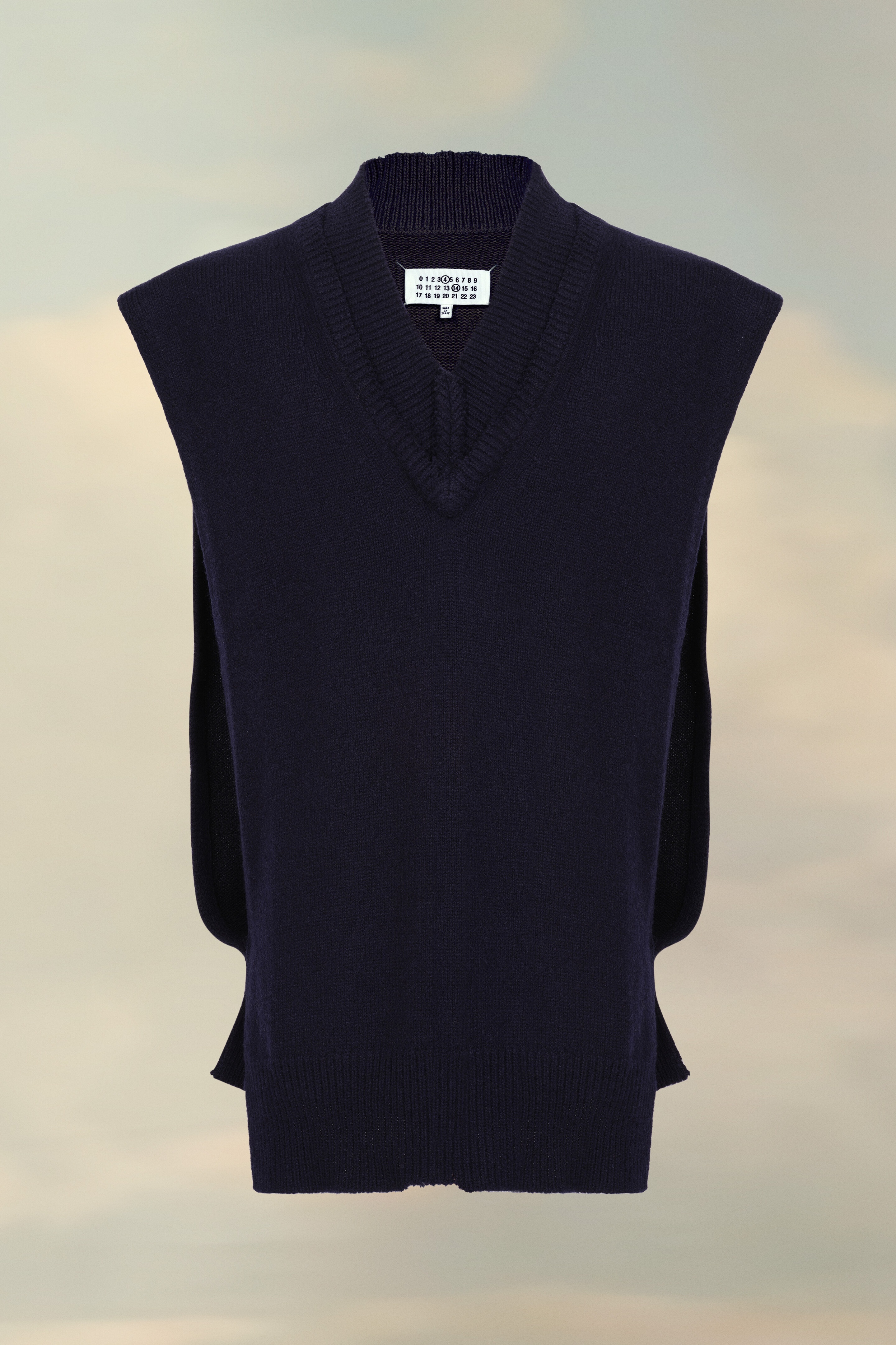 This oversized knit vest in jersey has a layered V-neck and ribbed trims for added texture. At the back, four white stitches show the hand of the Maison: the opposite of a label. Gauge 5. Product Details Item ID SI1TH0001S18064511F Composition: 46% Wool, 31% Linen, 23% Cotton V-neck vest Ribbed trims Décortiqué details Four stitches at the back Gauge 5 Made in Italy