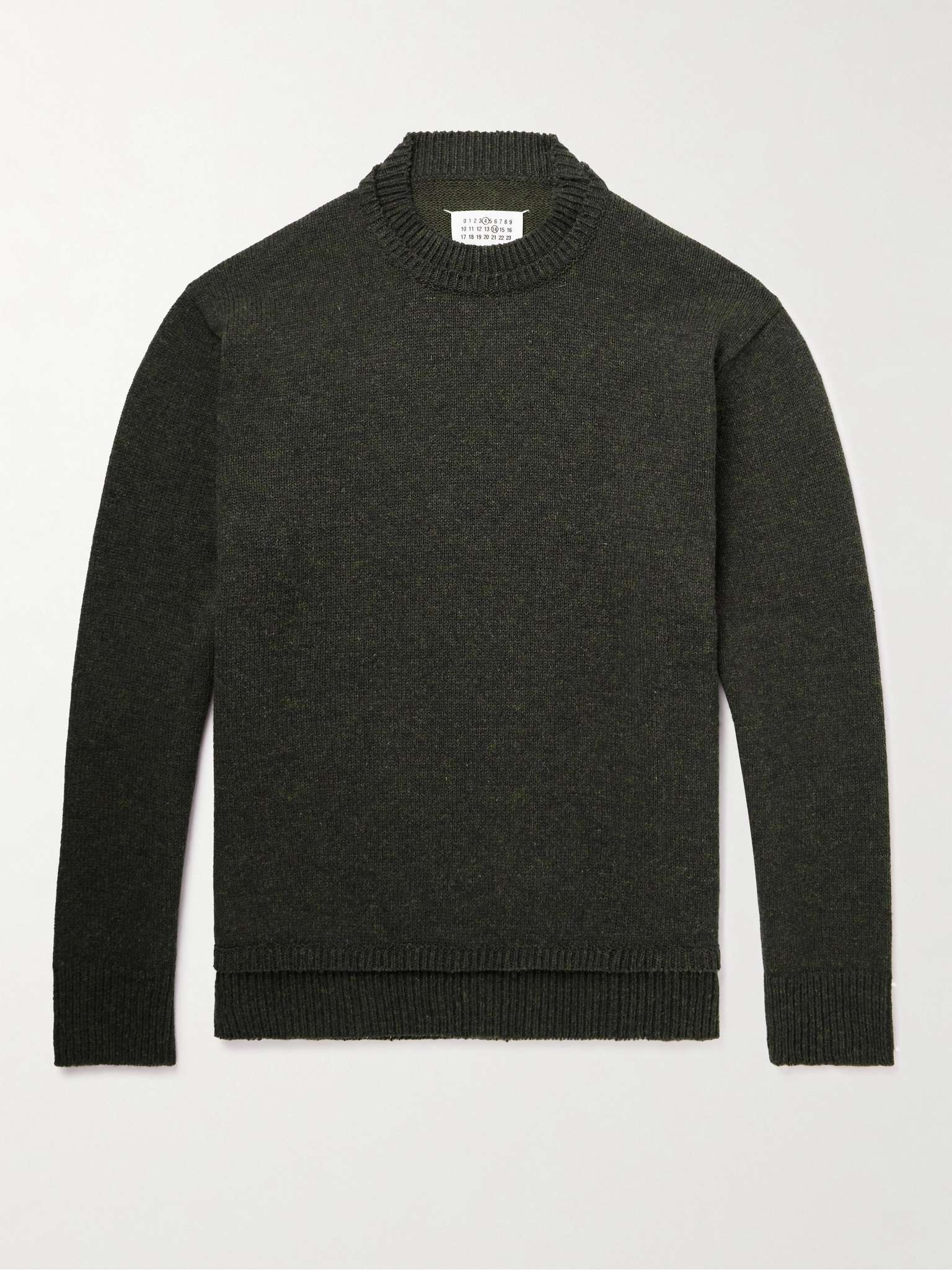 Maison Margiela's dark-green sweater has been spun in Italy from a five-gauge wool, linen and cotton-blend that's warm without feeling bulky. It's detailed with a double ribbed neckline, suede elbow patches and signature four white stitches in place of a label at the back. Size & Fit - Model wears a size larger to achieve a looser fit - Mid-weight knit - Model is shown wearing a M - Model measures: chest 36"/ 92cm, height 6'1"/ 185cm Details & Care - Dark-green mélange wool, linen and cotton-blend, army-green suede (Calf) - 46% wool, 31% linen, 23% cotton - Hand wash - This item has been imported
