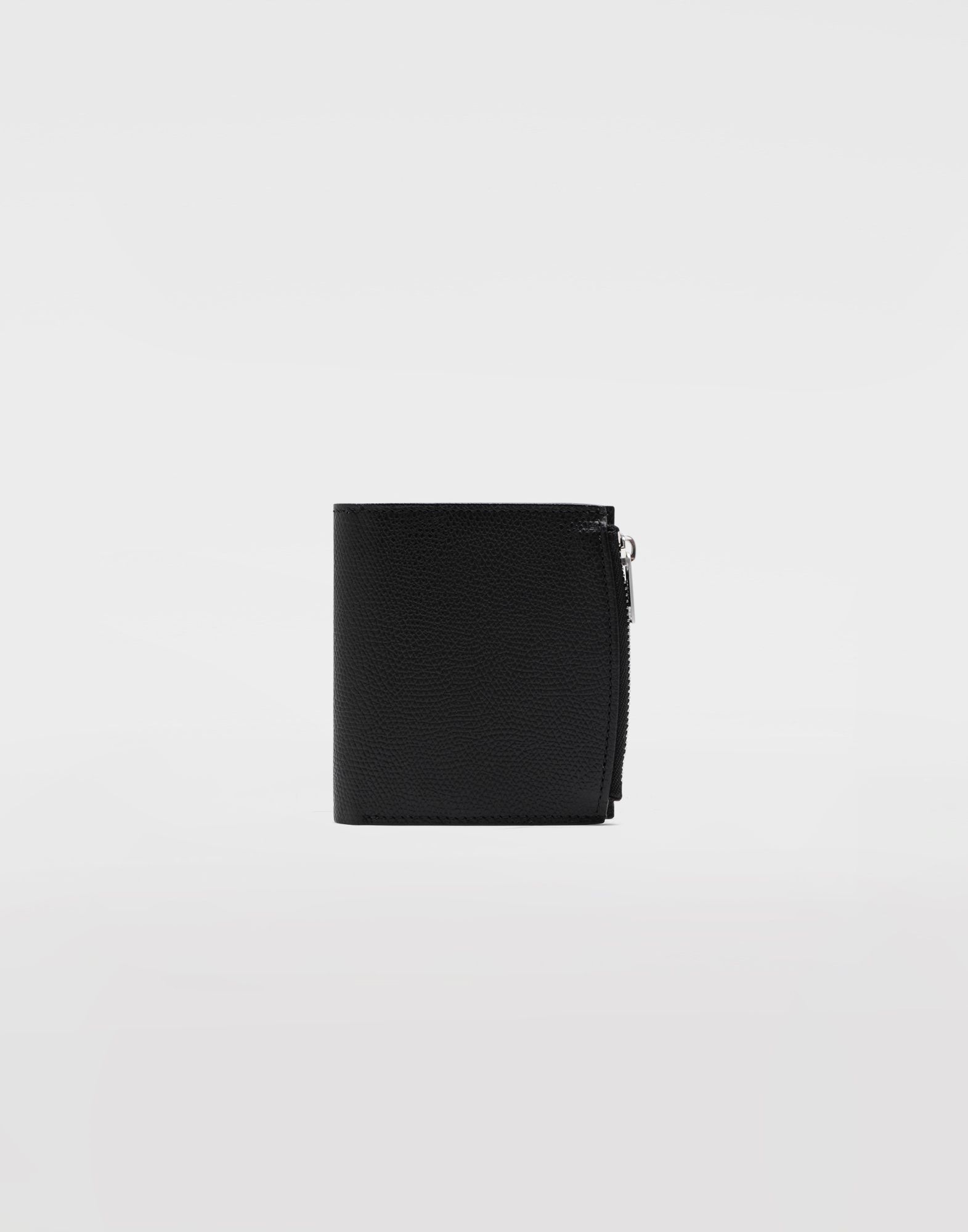 Folded wallet in grainy, embossed leather with 6 card slots, a billfold compartment and a zipped coin purse. It features the Maison Margiela logo on the inside and white four-stitch moniker on the outer. Made in Italy. Item details 100% Bovine leather Solid color Zip Internal card slots