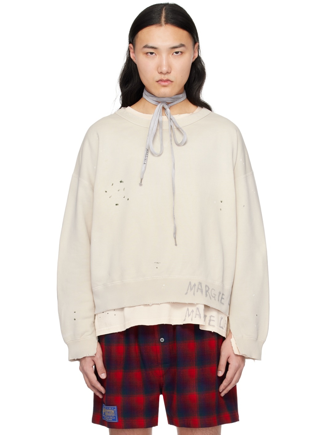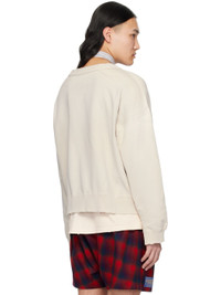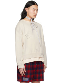 French terry sweatshirt. Distressing, fading, raw edges, and smudging throughout. · Rib knit crewneck, hem, and cuffs · Logo printed at front hem · Dropped shoulders · Vented cuffs · White stitching at back collar Supplier color: Dirty ecru