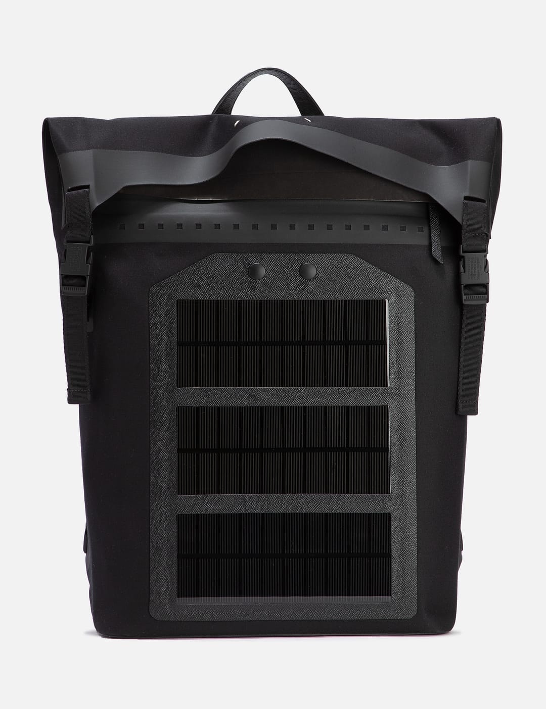 - Maison Margiela - Mackintosh Backpack - Mackintosh fabric - Fold-over design - Adjustable shoulder strap - Three solar panels on the front for external battery power - LED lights on the front - Buckle closure - One exterior zipped pocket - Top handle - Signature four-stitches moniker at the top - Color: Black - Material: Mackintosh fabric - See more Backpacks, Bags and Accessories SIZING Approximate dimensions: - Height: 55cm - Width: 30.5cm - Depth: 13cm - Handle Length: 7cm