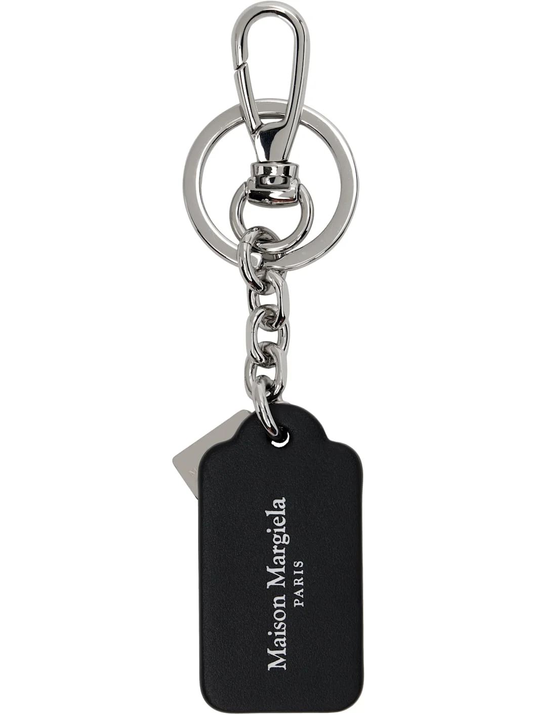 Buffed and pebble-grained leather keychain. · Logo plaque at drop · Logo printed at face · White stitching at back face · Keyring and clasp fastening · Silver-tone brass hardware · H5" x W1.5" Supplier color: Black Leather, brass. Made in Italy 261168M148000
