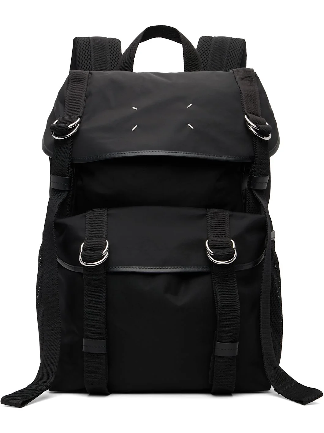 Nylon twill backpack. · Fixed carry handle · Adjustable padded shoulder straps · White stitching and flap pocket at face · Mesh patch pocket at sides · Bumper studs at base · Mesh panel and ID window at back face · Press-release flap · Drawstring closure · H18" x W14" x D6.5" Supplier color: Black Textile. Made in Italy 261168M166002