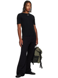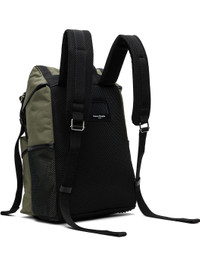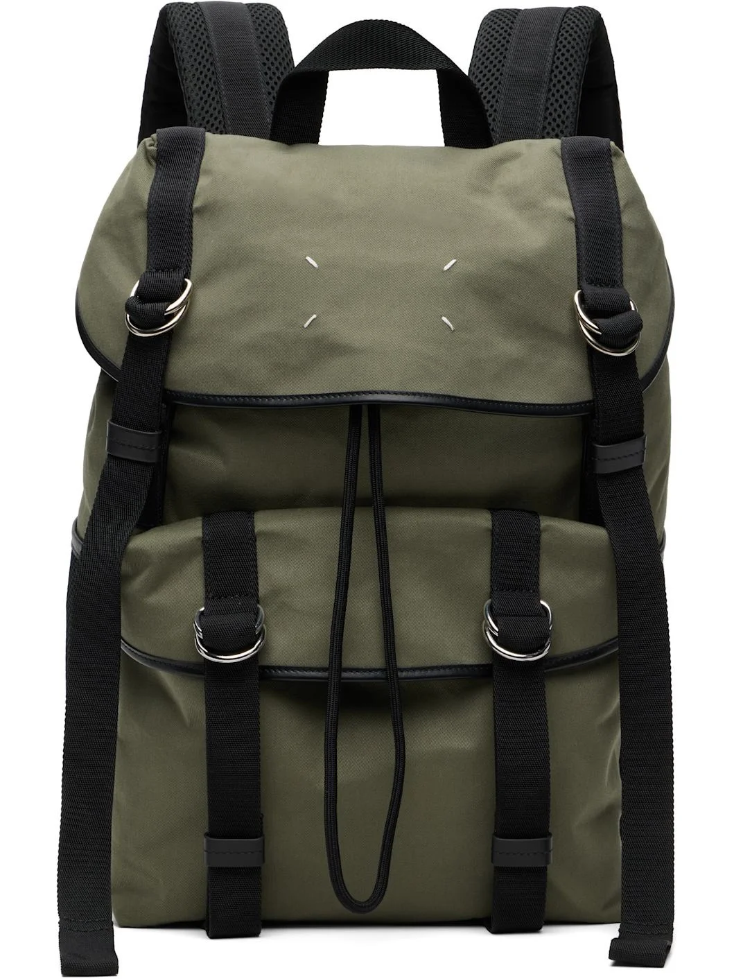 Satin twill backpack. · Buffed leather and webbing trim throughout · Carry handle · Adjustable padded shoulder straps · White stitching at face · Foldover flap compartment at face · Mesh pocket at sides · Padded mesh back face with ID slot · Foldover flap with press-release fastening · Concealed drawstring closure · Laptop compartment at interior · Twill and padded mesh lining · H19" x W12" x D5" Supplier color: Khaki/Black Textile. Made in Italy 252168M166001
