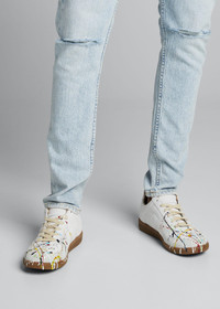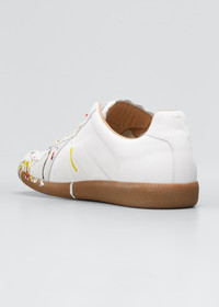 Maison Margiela "Replica" leather low-top sneaker Features a colorful splash of paint on front Round toe Lace-up vamp Tonal logo patch at tongue Cushioned insole Signature stitch detail at heel counter Leather lining Contrast rubber outsole Made in Italy Online Inquiries: BGS21_NDSQH| Store Inquiries: #2892268