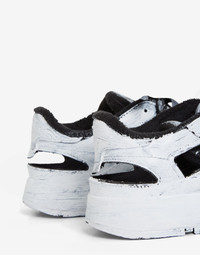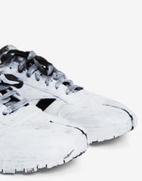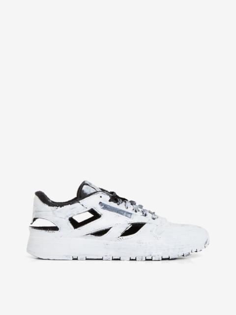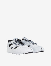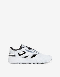 Reebok classic low-top runner from 1985 in leather with the Maison's Bianchetto treatment, reimagined in a couture variation with the signature Décortiqué aesthetic. Cut-out detailing elevates the "Anonimity of the lining" concept by revealing the inner lining and is reminiscent of a cage-like shape. Its split toe is inspired by the iconic Tabi shoe from 1988. The sneaker features dual logos on the tongue, with the Reebok signature on the side paneling and rear, while the hallmark Margiela stitch moniker adorns the back. Tonal Velcro closures and laces complete the style. Item details 100% Bovine leather Contains non-textile parts of animal origin Two-tone Round toeline Fully lined Rubber sole Brand logo Laces Leather