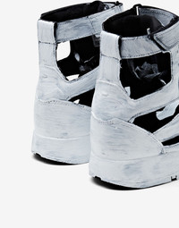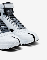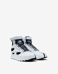 Reebok Classic leather high-top sneakers from 1985, reimagined by the Maison with the iconic Tabi cleft-toe shape from 1988. Décortiqué cut-out detailing showcases the ‘Memory of’ technique, reminiscent of a gladiator sandal and also plays with the concept of ‘Anonymity of the lining’, with the inner revealed. The sneakers feature dual branding with a logo tab on the tongue, Reebok logo to side and back, and the horizontal stitch moniker at the back. Tonal laces and rubber soles mix with an adjustable velcro ankle strap. Finished with the Bianchetto technique, a hand-painted distressed treatment, which purposely chips with wear for an evolving look. Item details 100% Bovine leather, Polyester Brand logo Laces Fabric inner Rubber sole