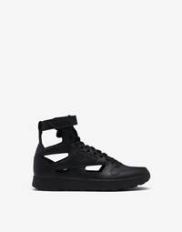 Reebok Classic leather high-top sneakers from 1985, reimagined by the Maison with the iconic Tabi cleft-toe shape from 1988. Décortiqué cut-out detailing showcases the ‘Memory of’ technique, reminiscent of a gladiator sandal and also plays with the concept of ‘Anonymity of the lining’, with the inner revealed. The sneakers feature dual branding with a logo tab on the tongue, Reebok logo to side and back, and the horizontal stitch moniker at the back. Tonal laces and rubber soles mix with an adjustable velcro ankle strap. Item details 100% Bovine leather, Polyester Brand logo Laces Fabric inner Rubber sole