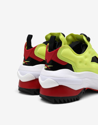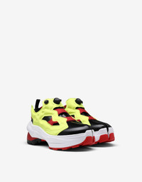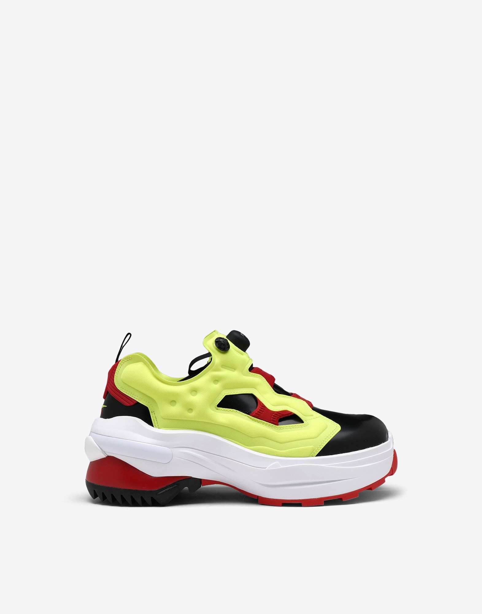 Colour block sneakers designed in collaboration with Reebok. The Maison's signature Tabi split-toe shape from 1988 unites with Reebok's trailblazing sneaker from 1994, the Instapump Fury. The pair come in a faux leather finish with a statement rubber sole – a Hexalite midsole provides cushioning and shock absorption and a Graphlite arch bridge lends flexibility and lightweight support. The Instapump foot chamber creates the maximum customised fit with a laceless construction. Featuring an architectural silhouette and utilitarian pull tab. Item details 100% Bovine leather, Polyurethane, Polyester Techno fabric Multicolor Pattern Laces Flatform Round toeline Rubber sole