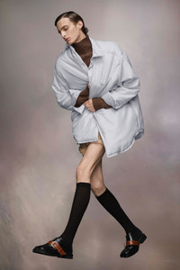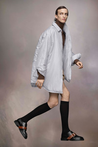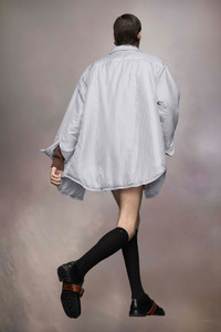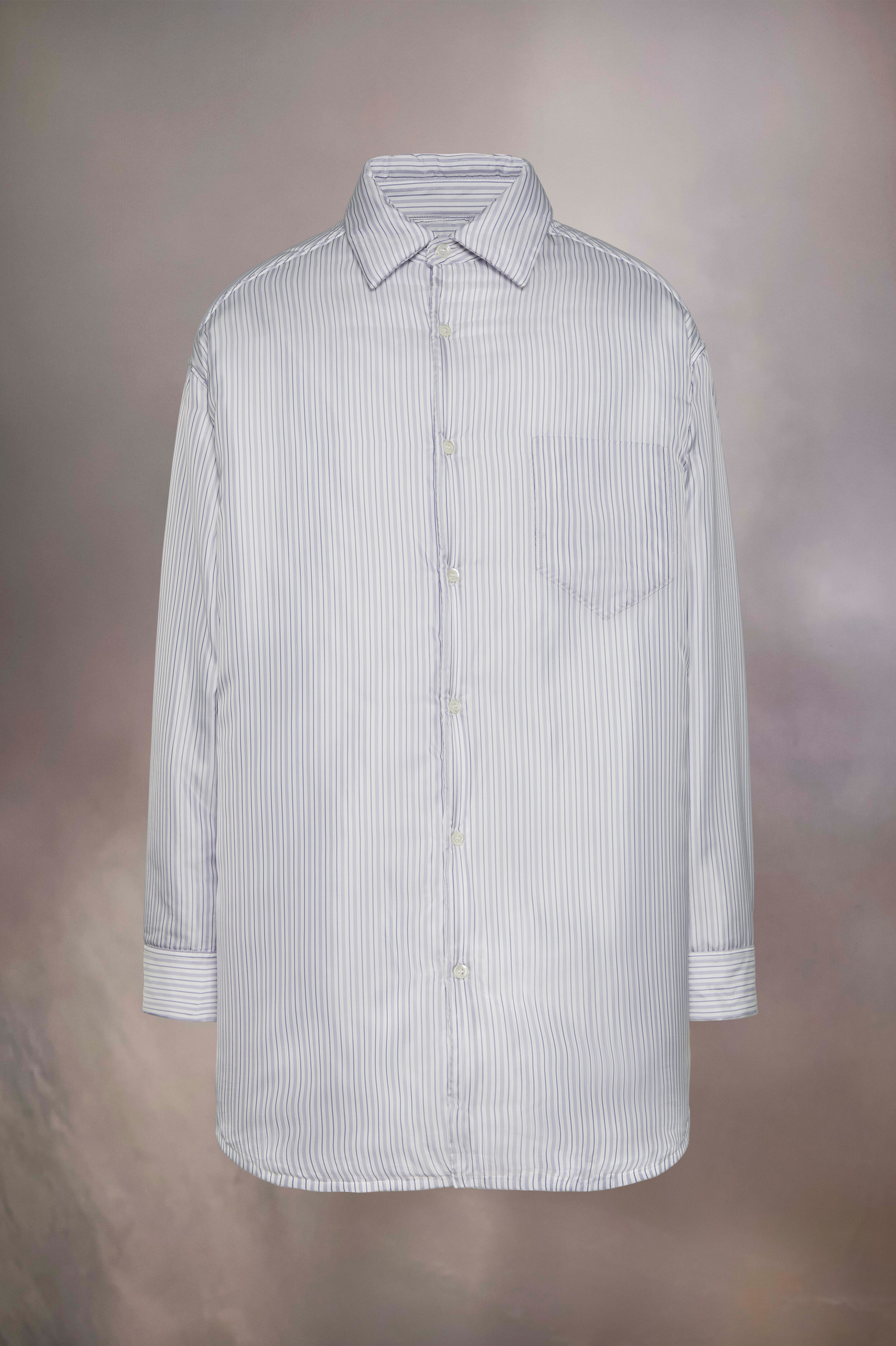 The shirt, made from cupro, follows an oversized, padded design. The silhouette is contrasted by the classic stripe material and smart collar with buttoned placket. Maison Margiela's signature, the Four stitches, appear at the back; the opposite of a label. Product Details Item ID S50DT0040M35204001F Composition: 100% cupro Padding: 100% polyester Cupro blue stripes padded shirt Pointed collar Mother of pearl button closure Buttoned cuffs Curved hem Side slits Four stitches at the back Oversize fit Made in Italy Model is 6'2" tall and wears a size 46.