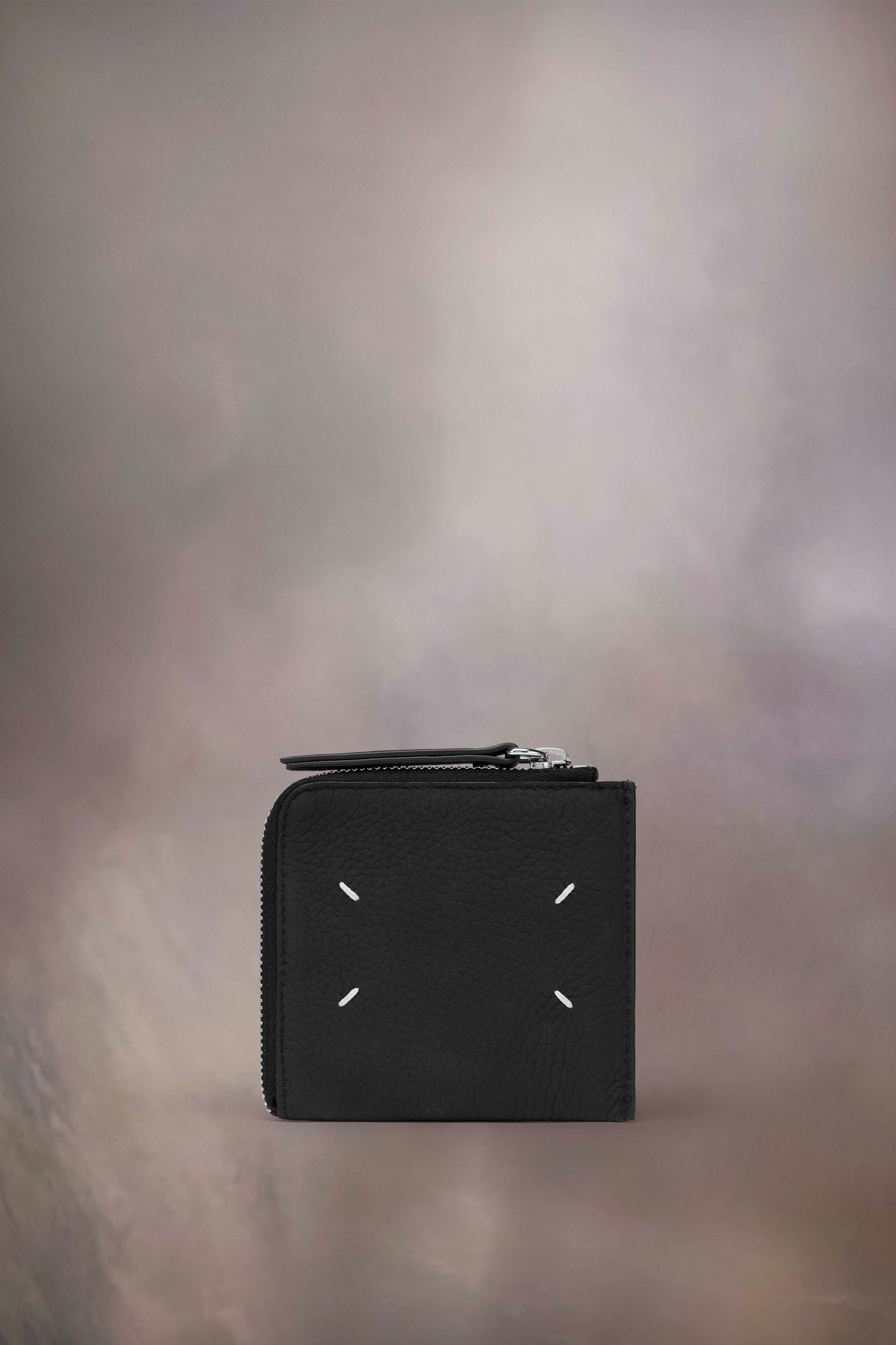 The wallet in deer leather has zip around design opening to multiple card holders and the logo. At the back, four white stitches show the hand of Maison Margiela; the opposite of a label. Product Details Item ID SA1UI0013P4746T8013 Outer: Deer leather with mat finish Inside: Calf leather Lining: Viscose Four stitchesat the back Zip closure with leather strap Inside logo stamping Inside flat pockets Three card slots Made in Italy 11 cm x 10,5 cm/4,3 in x 4,1 in (Length x Height)