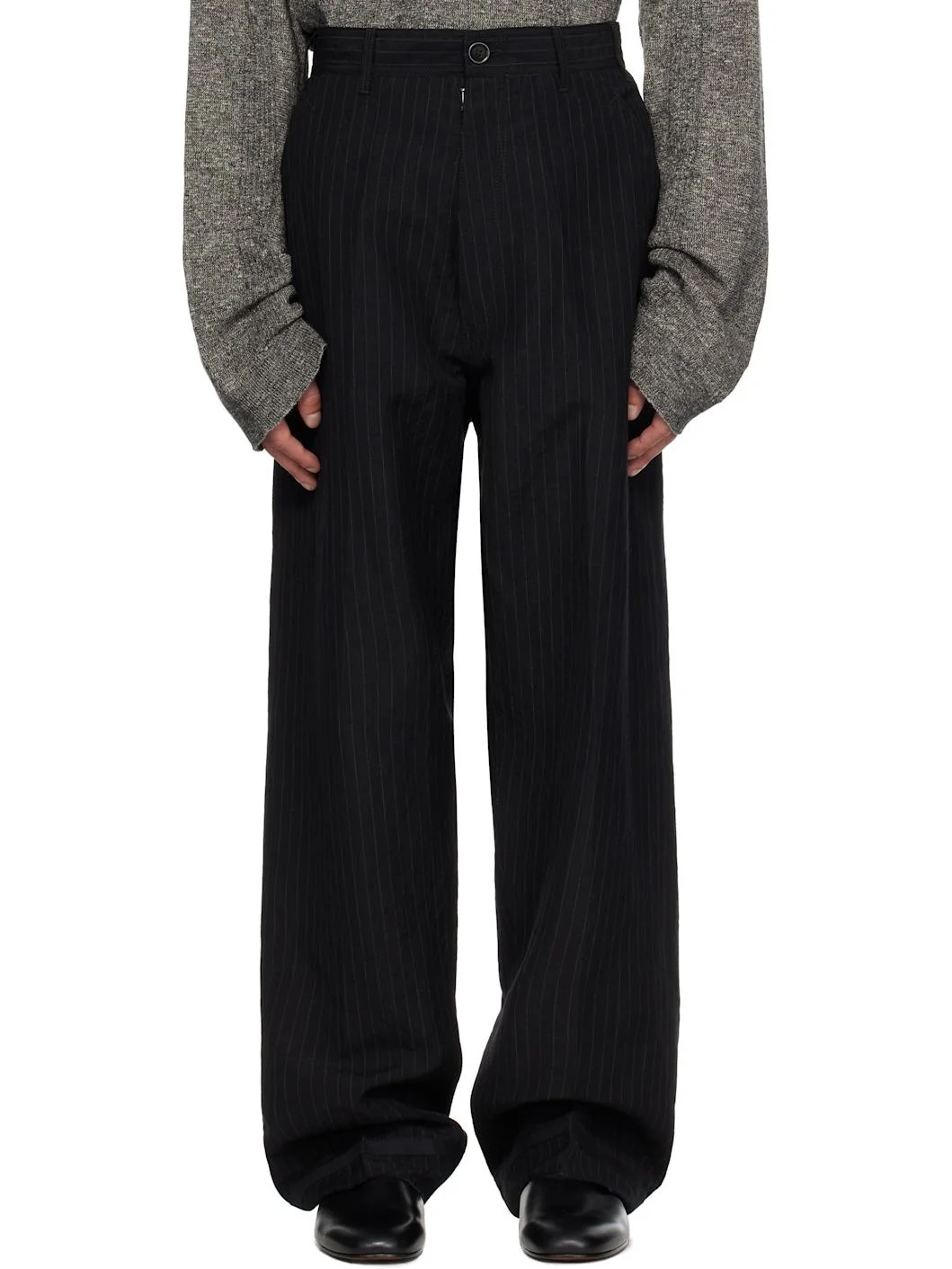 Linen- and wool-blend canvas trousers. Pinstripes throughout. · Belt loops · Four-pocket styling · Zip fly · Central crease at legs · Webbing trim at cuffs · Button tabs at back waistband · White stitching at back Supplier color: Black Body: 51% linen, 49% wool. Lining 1: 65% polyester, 35% cotton. Lining 2: 100% cotton. Made in Italy 251168M191014
