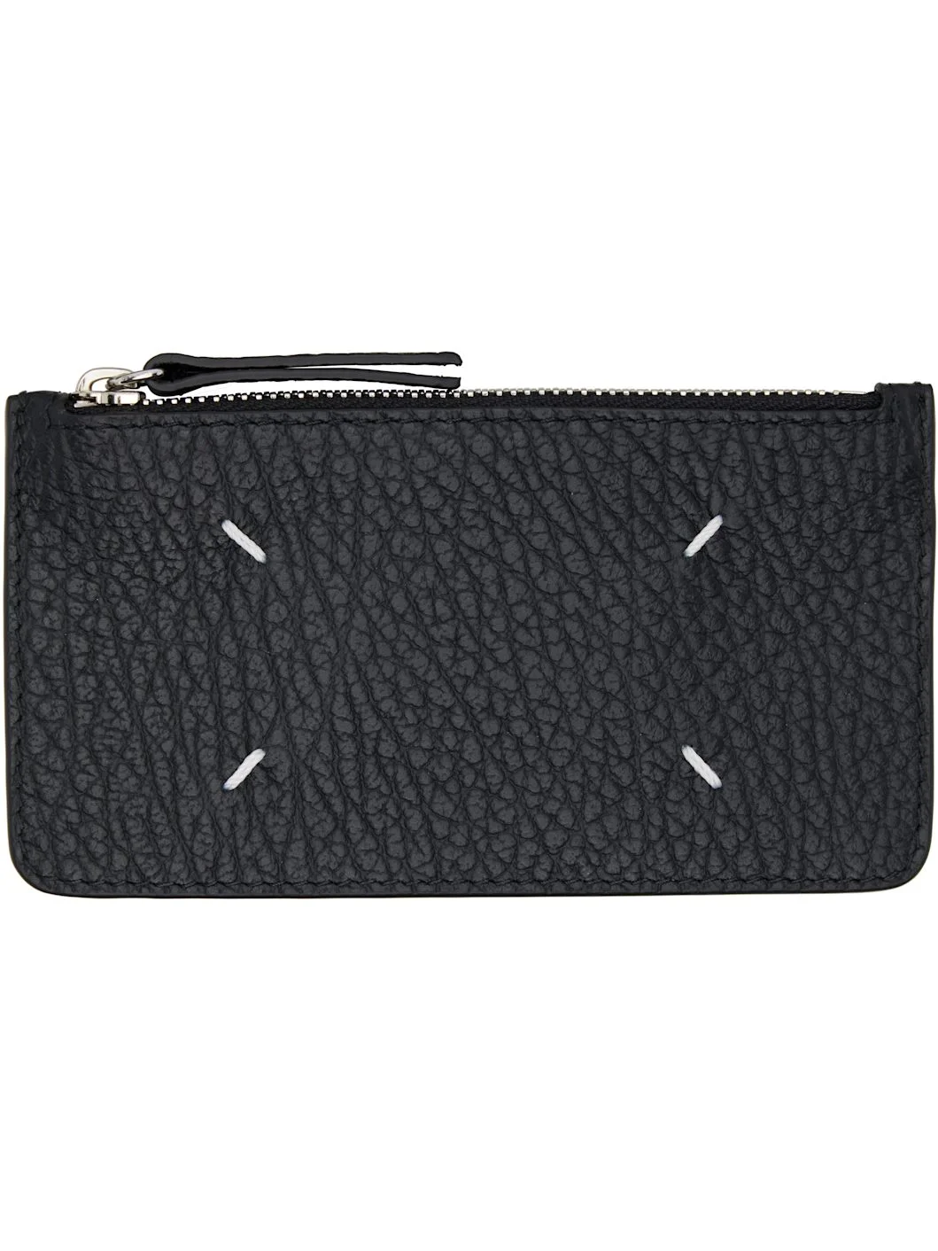Grained calfskin card holder. · Stitching at face · Zip closure · Five card slots · Canvas lining · H2.75” x W5” Supplier color: Black Calfskin. Made in Italy 261168M164011