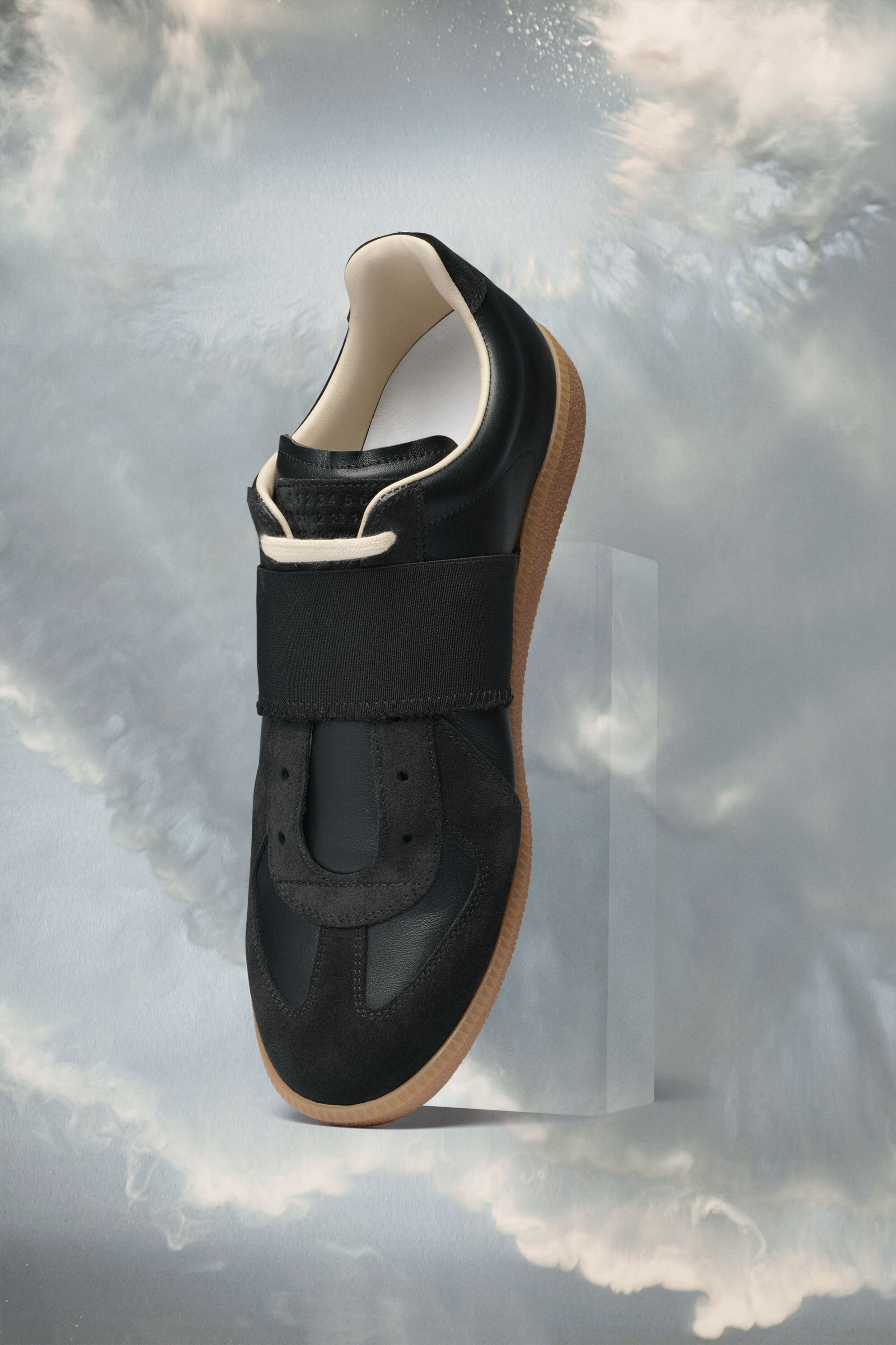 The Replica sneakers in calf leather and suede with a worn external elastic band and the iconic single stitch at the back. The Maison's Replica sneakers are inspired by Austrian sports shoes from the seventies. Details on the Replica pairs are continually reworked in line with the season's inspirations. Product Details Item ID S97WS0078P6843H9966 Upper: 100% calf leather Contrast: 100% calf leather Lining: 100% cotton Sole: 100% rubber Sneakers in smooth leather and suede leather Contrasting sole External elastic band with worn treatment Maison Margiela logo label on the tab White stitching at the back Internal Replica label All-over Maison Margiela logo insole Clean with a gentle leather cleanser Made in Italy A digital certificate provided by the Aura Blockchain Consortium guarantees the authenticity of this product. Discover more on auraluxuryblockchain.com/#about