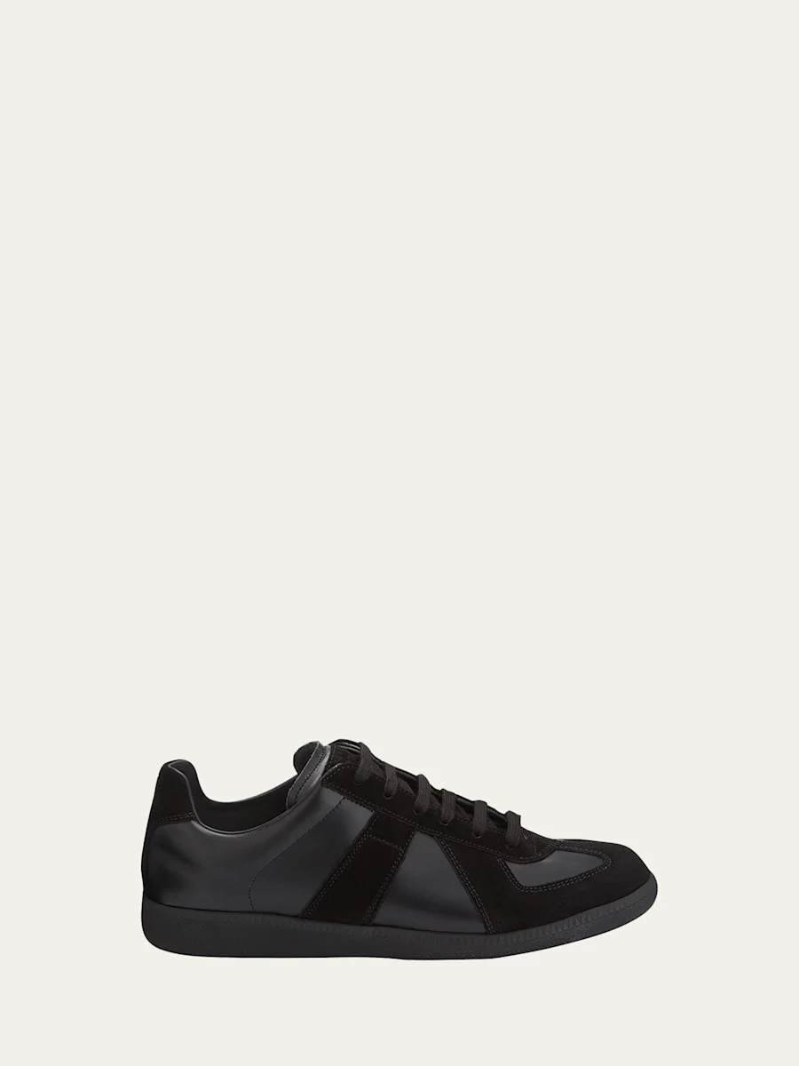 Maison Margiela lowtop sneaker in leather and suede. Round toe. Laceup front. Signature label at tongue. Padded collar. Maison Margiela signature white stitched label detail on back collar. Leather lining and insole. Rubber outsole. "Replica" is made in Italy.