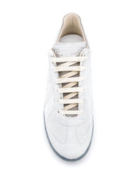 Replica sneakers Constructed in a minimalist aesthetic for which the brand is famed, Maison Margiela’s iconic Replica sneakers are presented in box fresh white lambskin suede and leather. Derived from the concept of timelessness; the Replica sneakers form part of Margiela’s larger Replica line and are inspired by German army sneaker designs. The geometric panelled upper sits atop a rubber gum sole and features a brand embossed tongue and insole. This sought-after design is given a tonal colour update with a multicolour paint splatter across the toe. Made in Italy Composition Outer: Calf Leather 100% Sole: Rubber 100% Lining: Calf Leather 100% SIZE & FIT Measurement Sole height 0.59 in(1.5 cm) HEEL 0.98 in(2.5 cm)