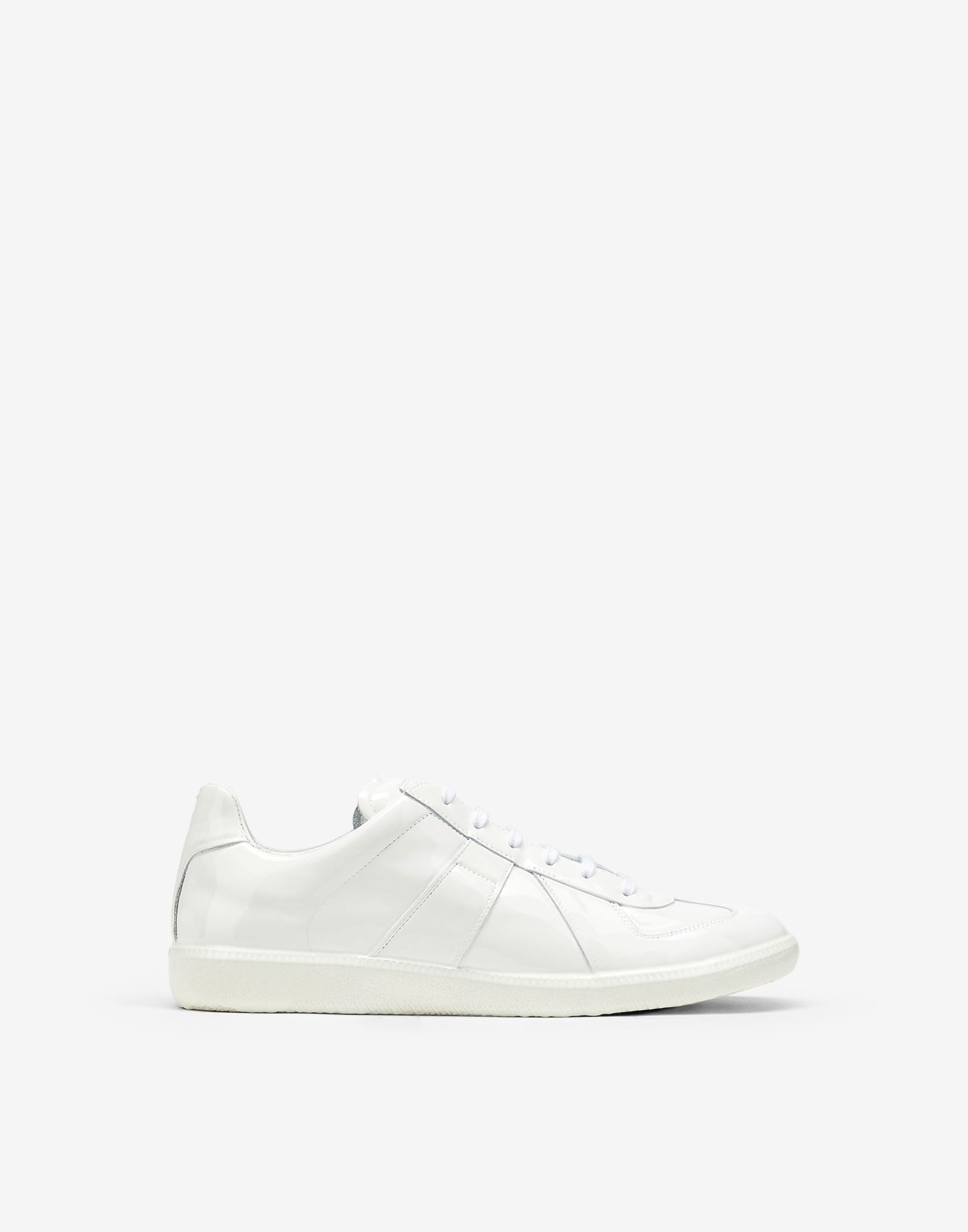 Replica sneakers in a shiny rubber treatment with the numerical logo on the tongue and iconic stitch mark at the back. The Maison's famous Replica sneakers are inspired by men's sports shoes from the Austrian province in the seventies. Details on the Replica pairs are continually reworked in line with the season's inspirations. Made in Italy. Item details 100% Bovine leather Varnished effect Brand logo Laces Round toeline Fully lined Rubber sole