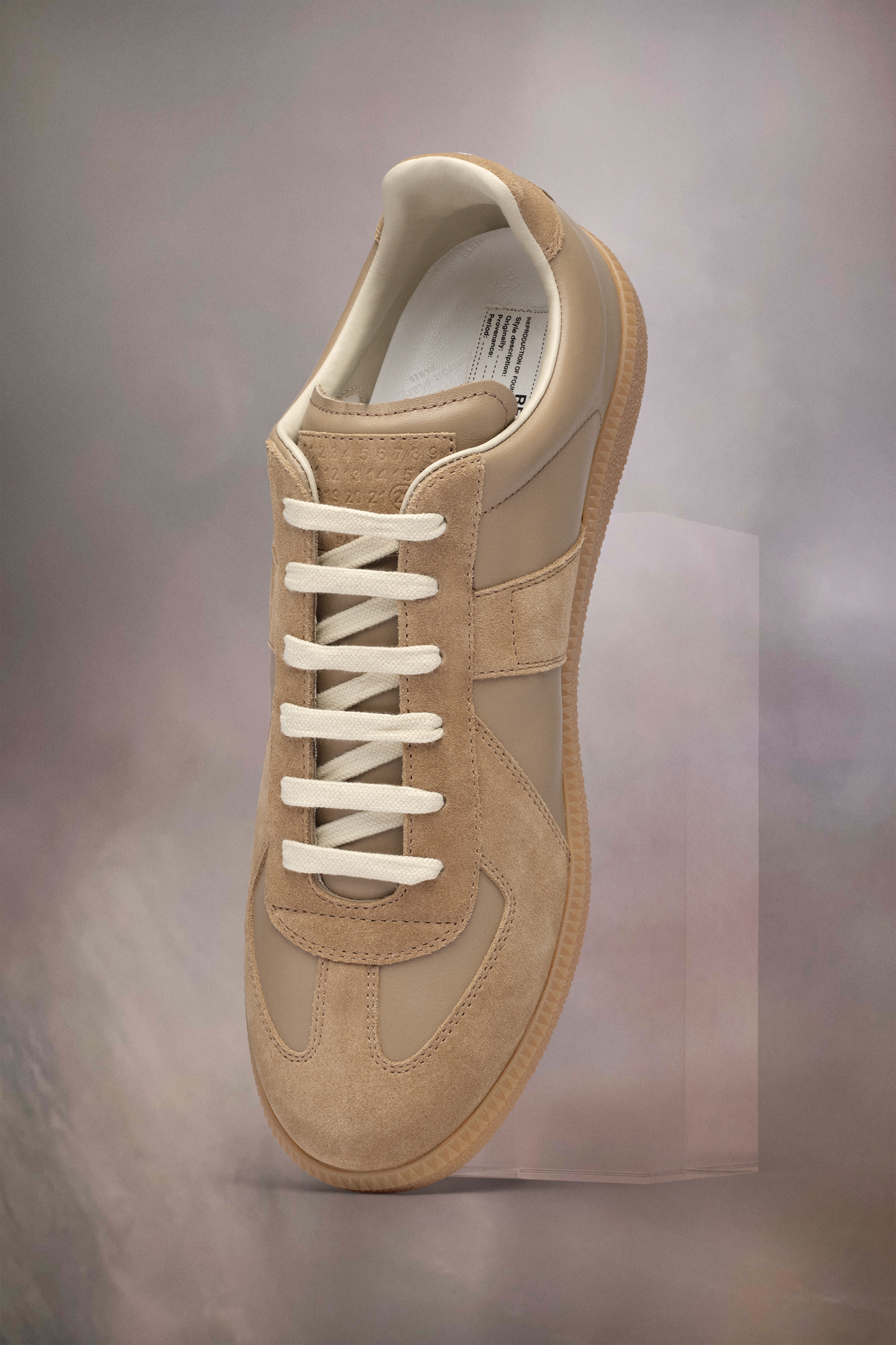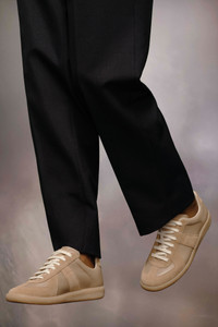 The Replica sneakers in nappa leather and suede with a honey sole. The Maison's iconic Replica sneakers are inspired by Austrian sports shoes from the seventies. Details on the Replica pairs are continually reworked in line with the season's inspirations.