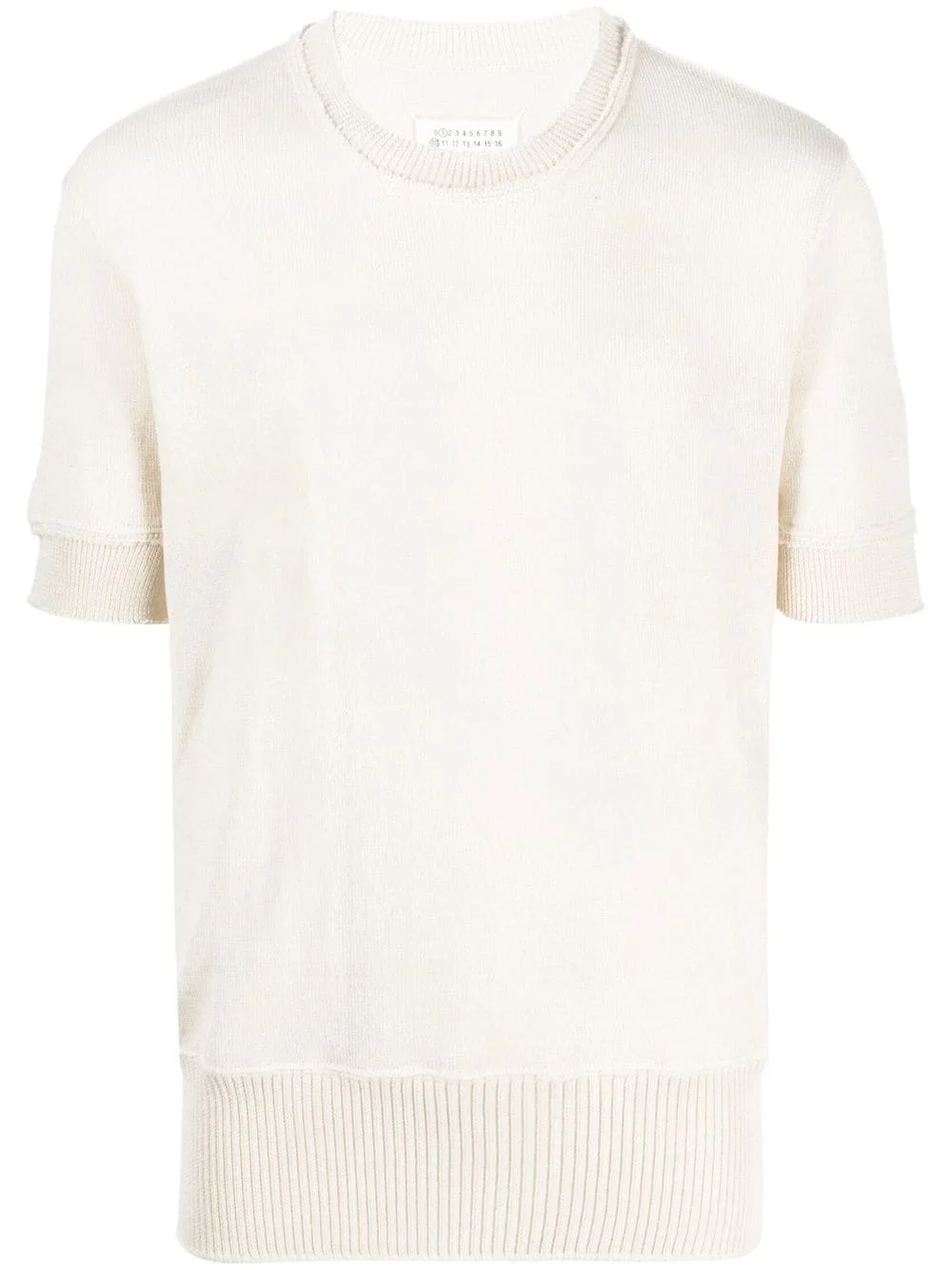 ripped-edge knitted T-shirt cream white wool blend knitted construction round neck ripped detailing short sleeves straight hem Imported Composition Lining: Wool 62% Acrylic 26%, Polyamide 12% SIZE & FIT Model measurements Height 6 ft 3 in(1.91 m) Bust/Chest 37 in(94 cm) Hips 37.79 in(96 cm) Waist 28.34 in(72 cm) FittingInformation This piece fits true to size. We recommend you get your regular size Cut for a slim fit Made with a mid-weight fabric Washing instructions Dry Clean Only