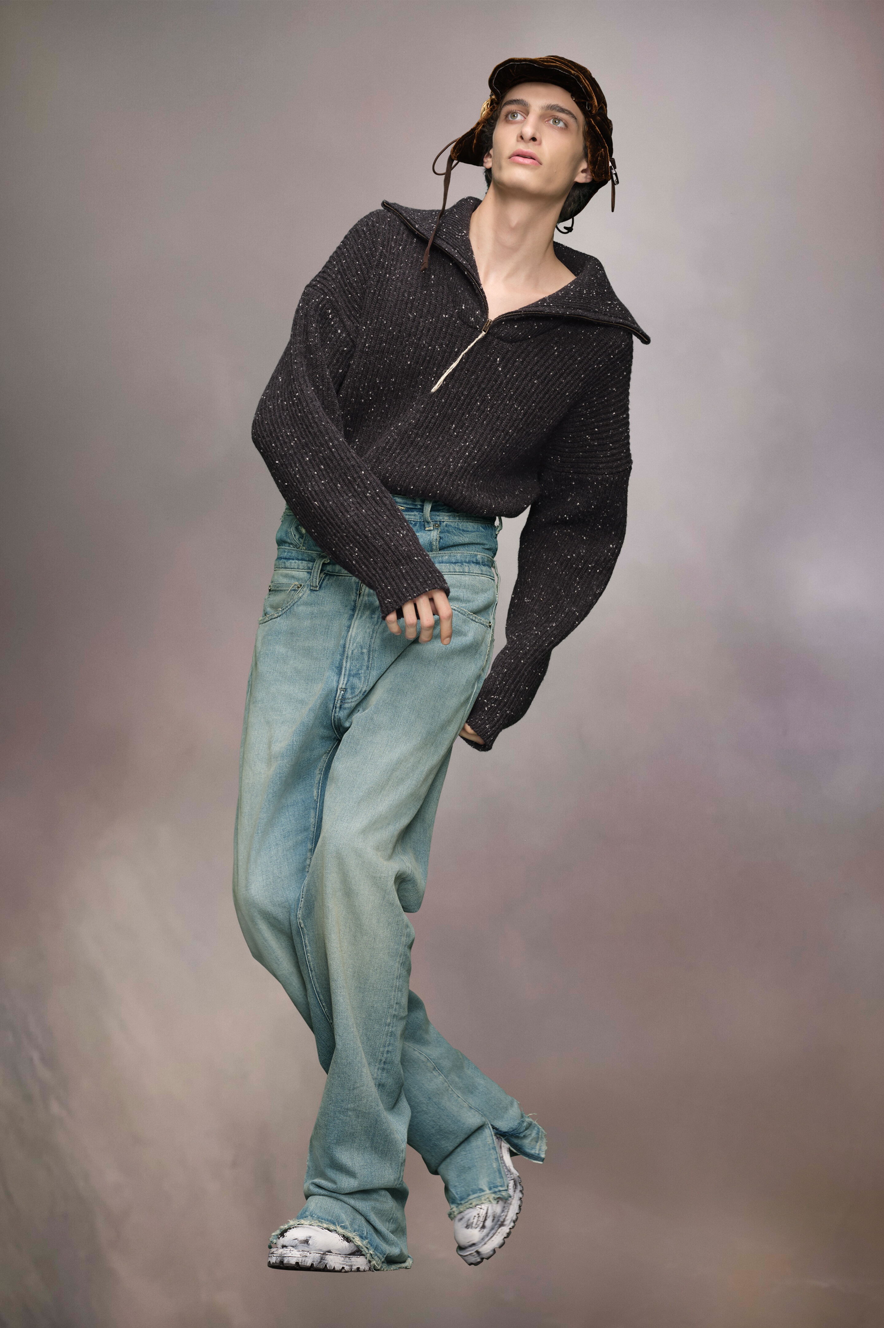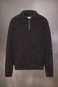 Part of the spring Shetland theme, made in transseasonal linen and authentic Shetland wool blend, the sweatshirt features a relaxed volume with zipped neckline, complete with thread pull. It has a ribbed finish and unique colouration. Maison Margiela's signature, the four stitches, appear at the back; the opposite of a label. Product Details Item ID S50HL0039M13094855F Primary Fabric: 65% Linen 35% Virgin Wool Gauge 5 Wool cardigan Polo neck Zip closure Ribbed trims Four stitches at the back Model is 189 cm tall and wears a size S.