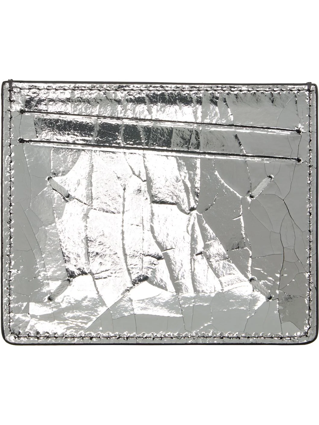 Cracked patent calfskin card holder. · White stitching at face · Five card slots · Central note slot · H3.5" x W4" Supplier color: Silver/Black Calfskin. Made in Italy 252168M163034